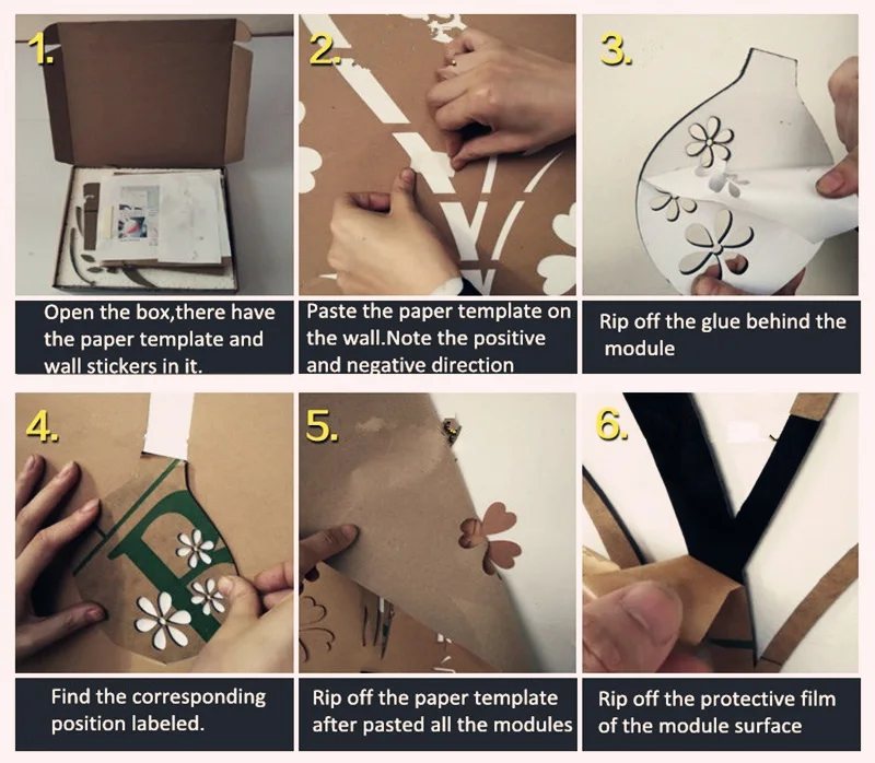 Note: 1. Do not imagine the size, please check the wall size and sticker's size carefully. 2. For installation, we add paper template in the box, its crease and breakage don't belong to quality issue. 3. This wall sticker's installation take time, for 3 people, it will need about 3-5 hours to complete it!