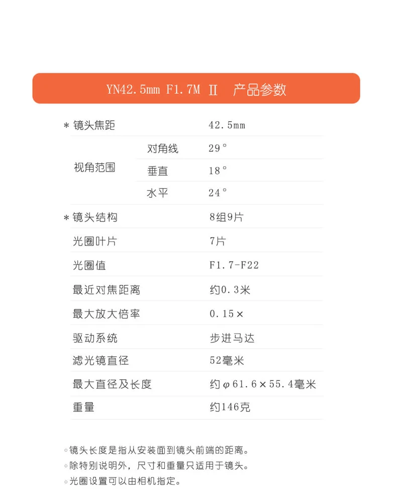 YN42.5mm F1.7M Standard стандартные основные характеристики объектива