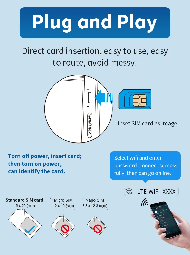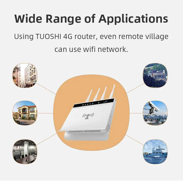3. Просто подключите sim-карту оператора и он может осуществлять поиск и подключение для достижения высокоскоростного широкополосного доступа 3G/4G автоматически. Продукт также предоставляет горячие точки Wi-Fi, которые пользователи могут подключить мобильный телефон и компьютер для доступа к Интернету.