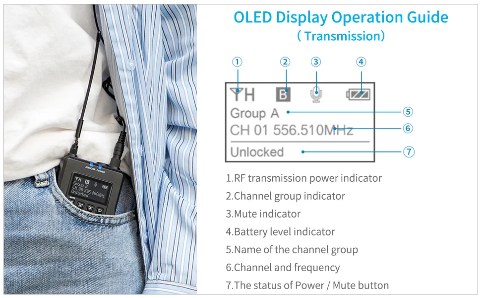 Saramonic UwMic9S-TX9S является монтируемым корпусом передатчика. Он оснащен простым в считывании oled-дисплеем, съемной антенной и встроенной перезаряжаемой батареей. С линейным входом и входным разъемом микрофона, он может принимать аудио от В комплекте 3,5 мм замок петличный микрофон или другая линейного уровня устройств, короткое нажатие кнопки включения отключение микрофона между берет. Функция блокировки предотвращает передатчик от приглушенный или выключен Случайно.
