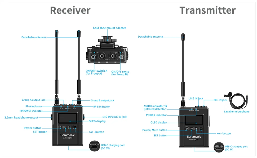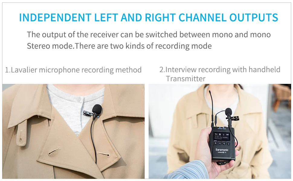 ВБеспроводная микрофонная система Saramonic UwMic9sПредоставляет высококачественное беспроводное аудио-решение для 2 человек для трансляции и телевидения, ENG, кинематографистов, vloggers, мобильных журналистов и создателей контента по замечательной цене, это простое в использовании, высококачественная и Гибкая UHF Система, внешний вход позволяет приёмнику подключаться к микрофону Или устройство линейного уровня, например микрофон дробовика, миксер, диктофон или музыкальный плеер для захвата дополнительного звука или музыки. Система может питаться через USB-C порты, что позволяет ей работать в течение многих часов на USB-C 5V power bank.
