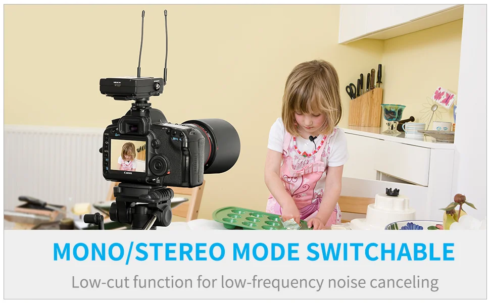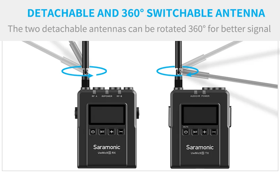 Saramonic UwMic9s RX-это двухканальный беспроводной приемник UHF с камерой. Он оснащен широким переключением полосы пропускания RF, высококонтрастным oled-дисплеем и инфракрасным излучением, синхронизацией между передатчиком и приемником. Две съемные антенны можно поворачивать на 360 ° для лучшего приема. Выход приемника может быть переключен между моно и стерео режимами, функция низкой резки на приемнике минимизирует низкочастотные колебания.