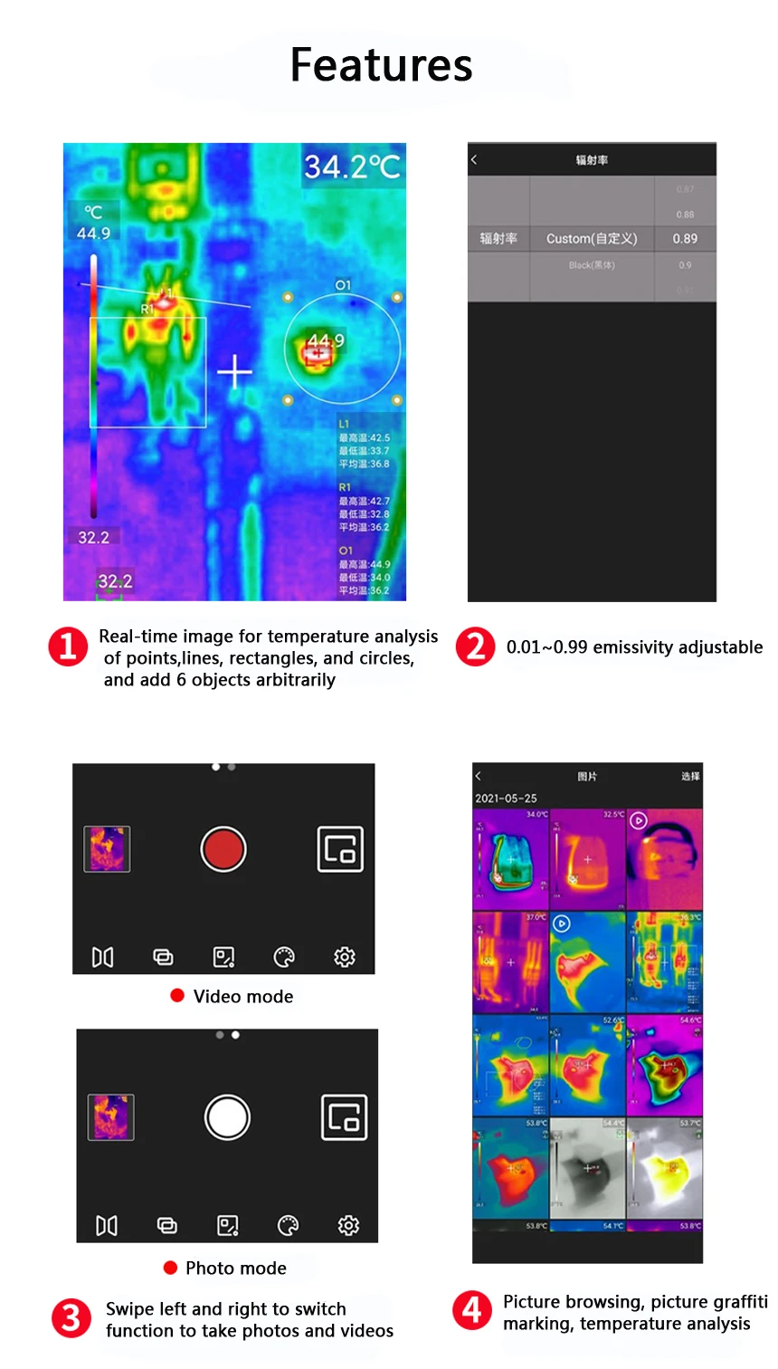 Это используется для проверка распределительного шкафа, проверка электронных печатных плат, проверка ОВКВ, проверка опасности источника тепла внутри и снаружи, проверка нагревательных труб, промышленная проверка.