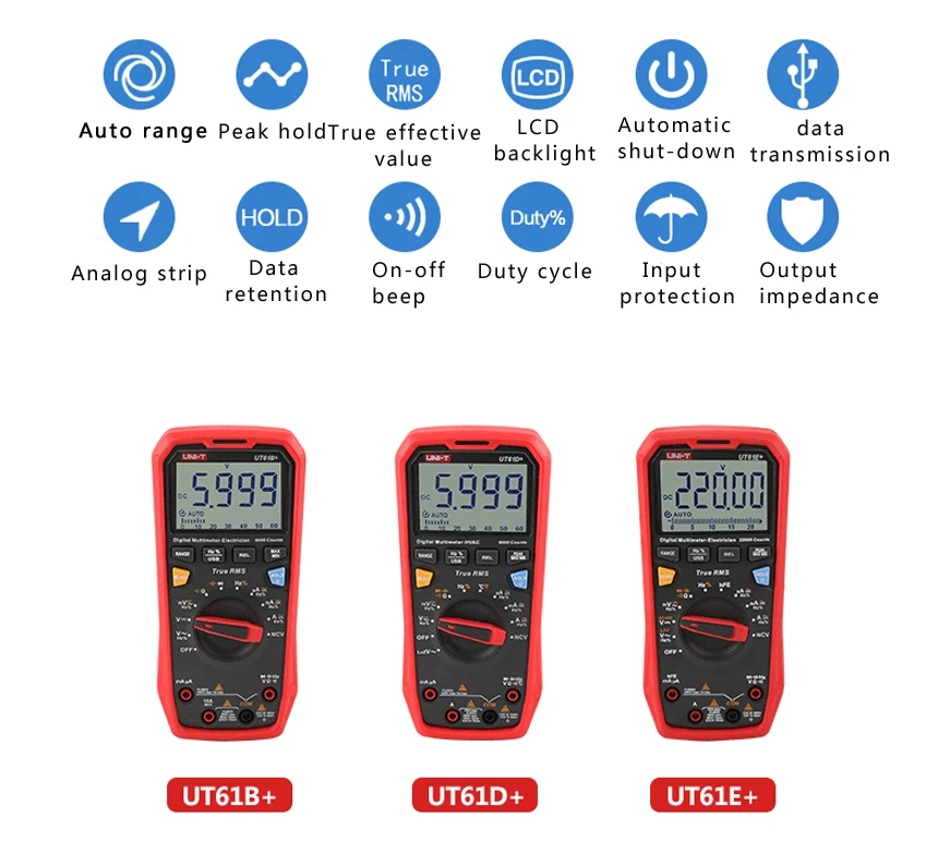 Серия UT61 +-это надежные цифровые мультиметры RMS с отображением 6000 (UT61B +/D +) и 22000 (UT61E +).