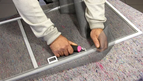 Размер ячейки 1.2 х1.2 мм. Цвет - серый, является оптимальным так как незаметен на фоне светового проёма. Представляет из себя полимерное стекловолокно, ячеистой структуры. Материал устойчив к воздействию солнечного ультрафиолетового излучения, имеет отличную водостойкость и обладает высокими прочностными характеристиками на разрыв и растяжение. Материал мягкий и легкий.