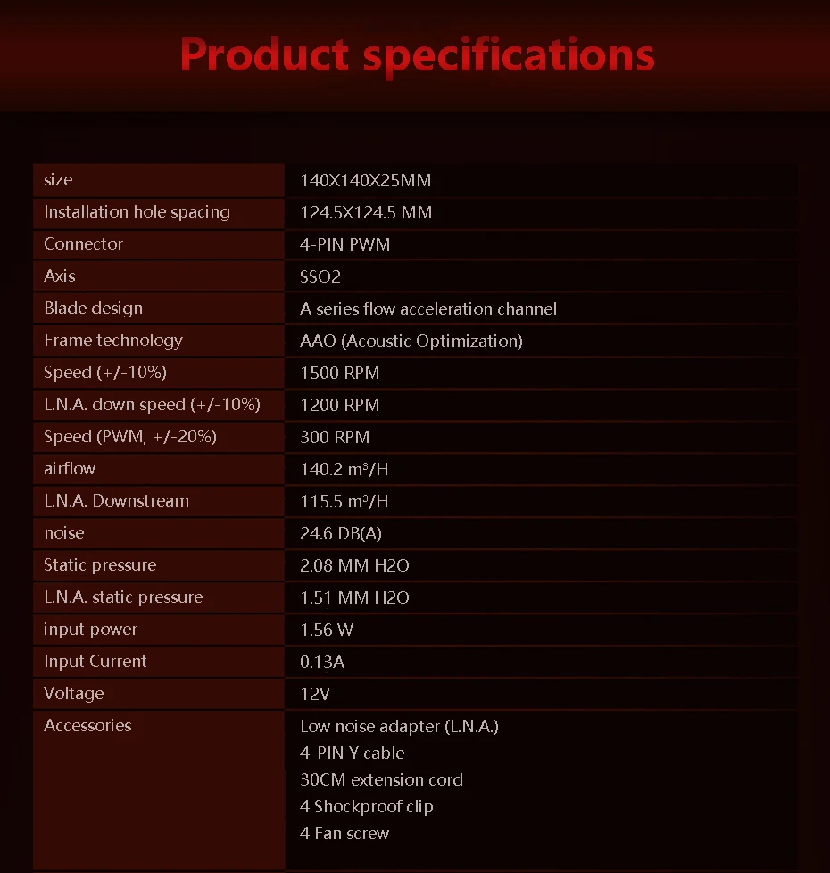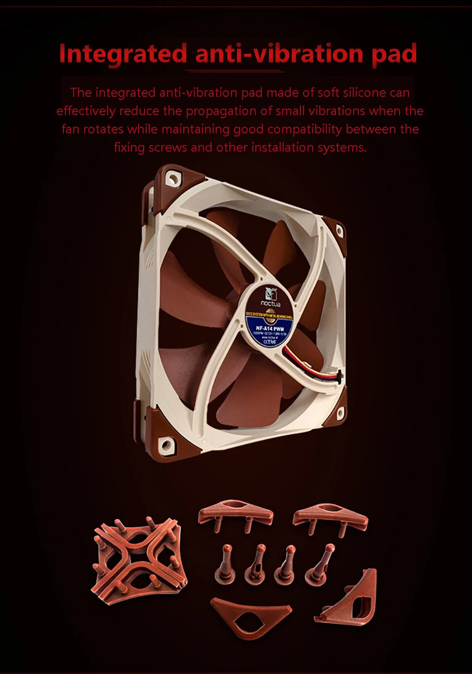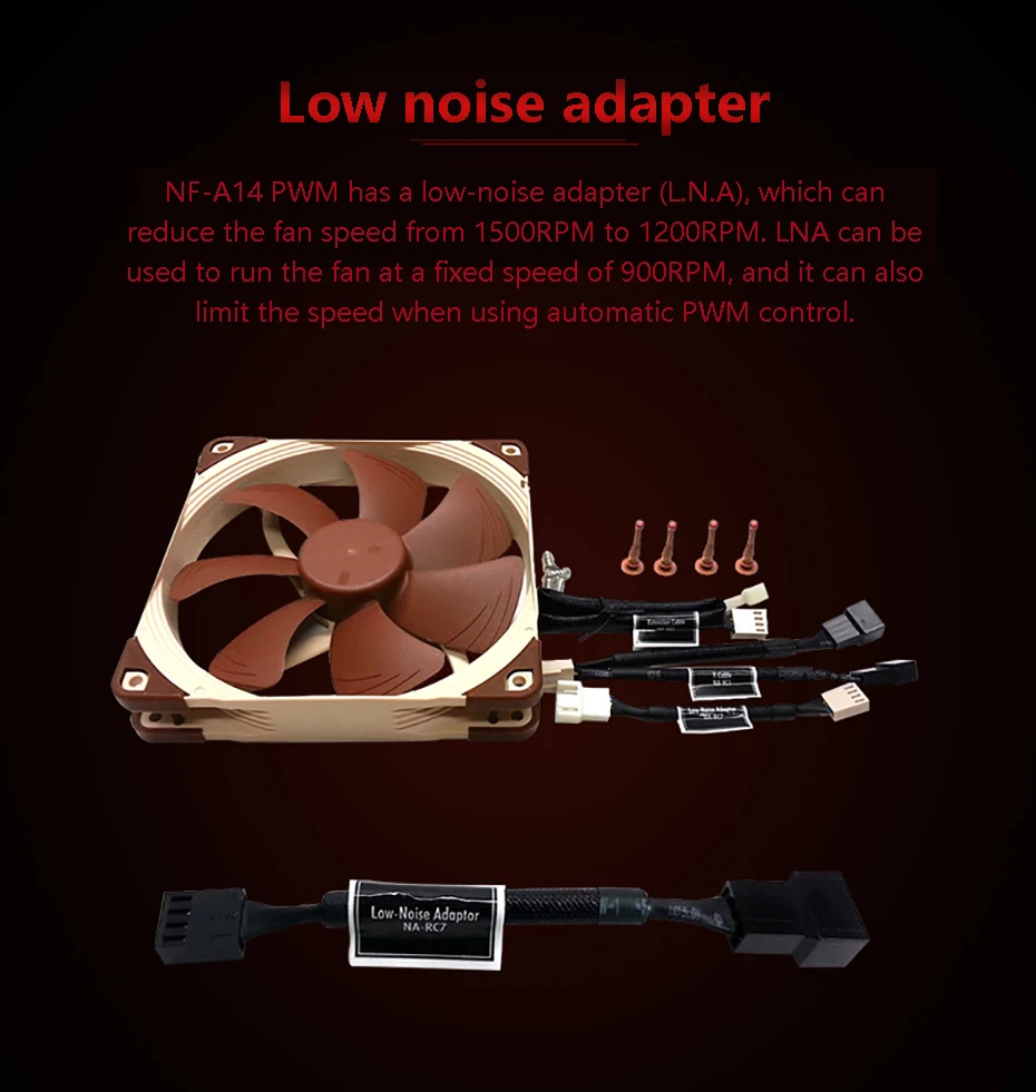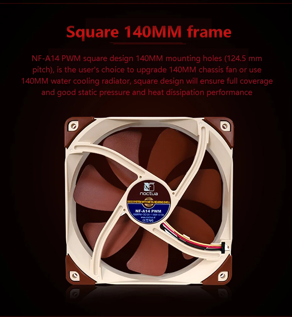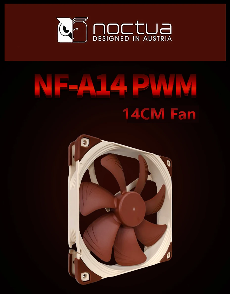 NF-A14-это высококачественный тихий вентилятор 140 мм с квадратной рамой, соответствующий стандарту Noctua AAO (продвинутая акустическая оптимизация). Его квадратная форма и 140 мм монтажные отверстия (124,5 мм расстояние) делают его идеальным для использования на радиаторах водяного охлаждения или в качестве обновления для вентиляторов 140 мм чехол. Благодаря утонченным аэродинамическим измерениям, таким как каналы ускорения потока, NF-A14 еще больше улучшает известную тихую производительность охлаждения отмеченных наградами NF-P14. PWM Версия спортивные Noctua, Таможня Конструировала NE-FD1 IC для полностью автоматическим регулятором скорости с помощью 4-контактных вентиляторов и поставляется с низким уровнем Шум-адаптера переменного тока для того, чтобы уменьшить Максимальная скорость во время ШИМ от 1500 об/мин до 1200 об/мин. Его ориентированная на производительность Максимальная скорость 1500 об/мин и комплексные варианты контроля скорости делают NF-A14 PWM элитным выбором для пользователей, которые стараются достичь идеального баланса между отличной охлаждающей способностью и превосходной тишиной работы, будь то радиатор водяного охлаждения, радиатор или чехол для вентиляции.