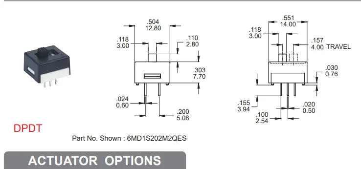 Тайвань с ограниченной отвественностью компании Dailywell, рычажный переключатель 6-pin-код 3 файлы в он-лайн вертикальный двухрядный 6-контактный раздвижные 5,08 мм Шаг ВКЛ-ВЫКЛ-на 3A120V/1A250V 6MD3S202M4QES, оригинальный и аутентичный с подробную информацию и чертеж, с указанием размеров