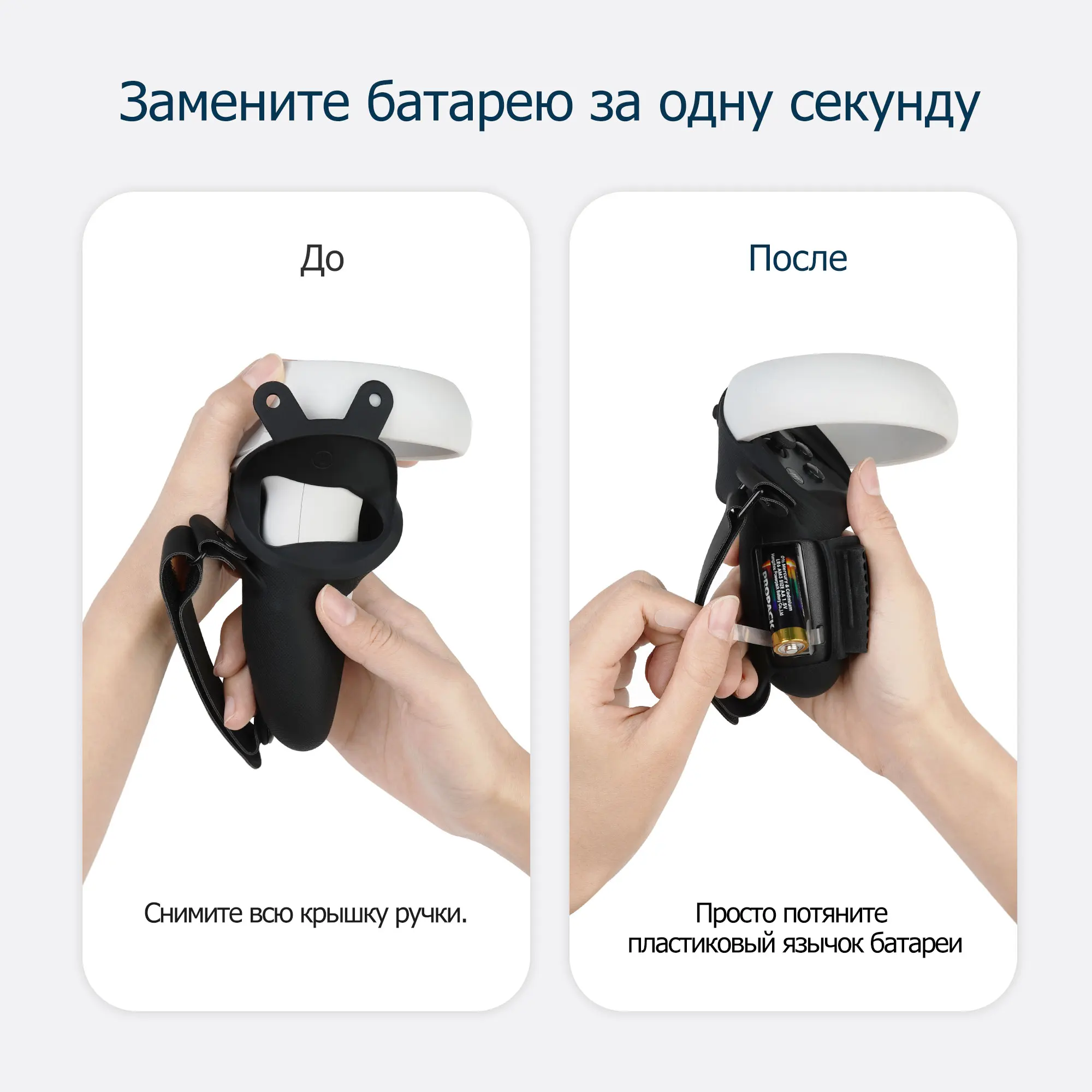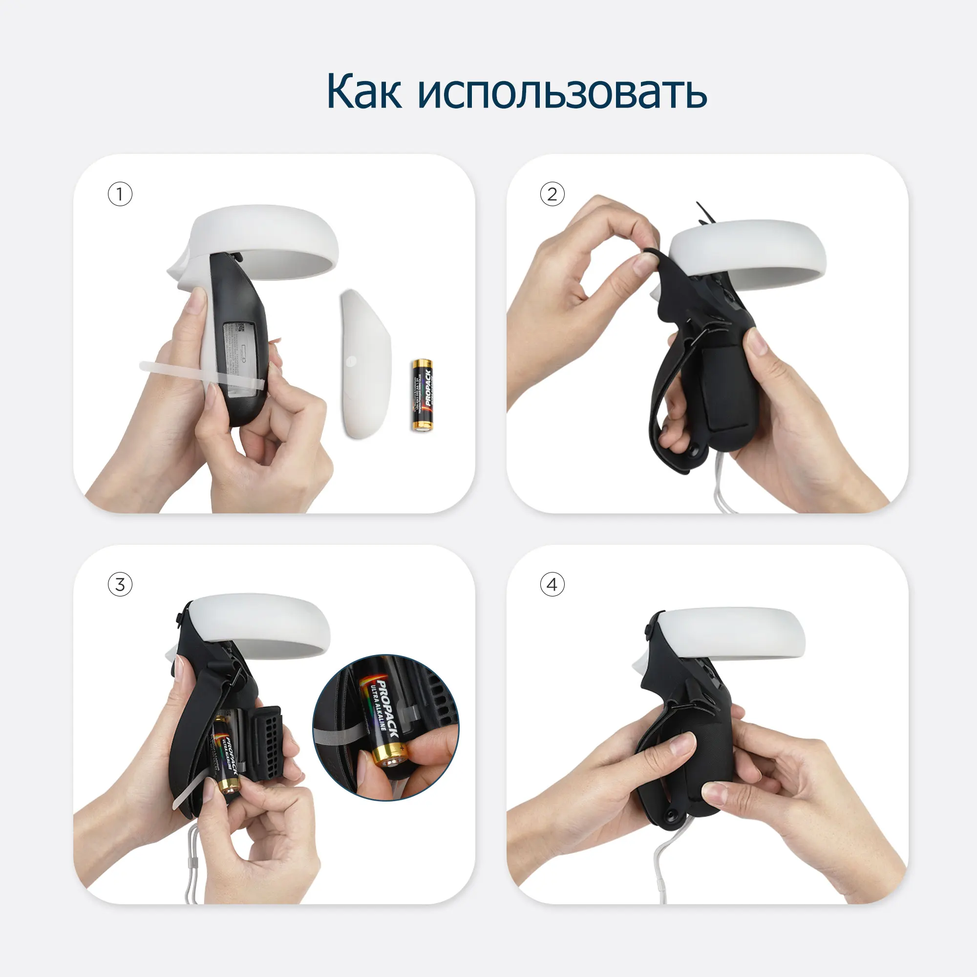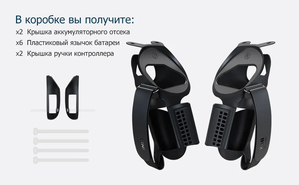Отдельная конструкция позволяет легко встроить крышку ручки в контроллер или снять ее. Есть 2 фиксирующие пряжки, чтобы исправить это, не беспокойтесь о том, что при интенсивных упражнениях крышка ручки начнет отваливаться. В комплект поставки входят: 1 пара накладок на ручки сенсорного контроллера с ремешками для кулаков, 1 пара крышек батарейного отсека и 6 пластиковых язычков. Обратите внимание: аккумулятор в комплект не входит!