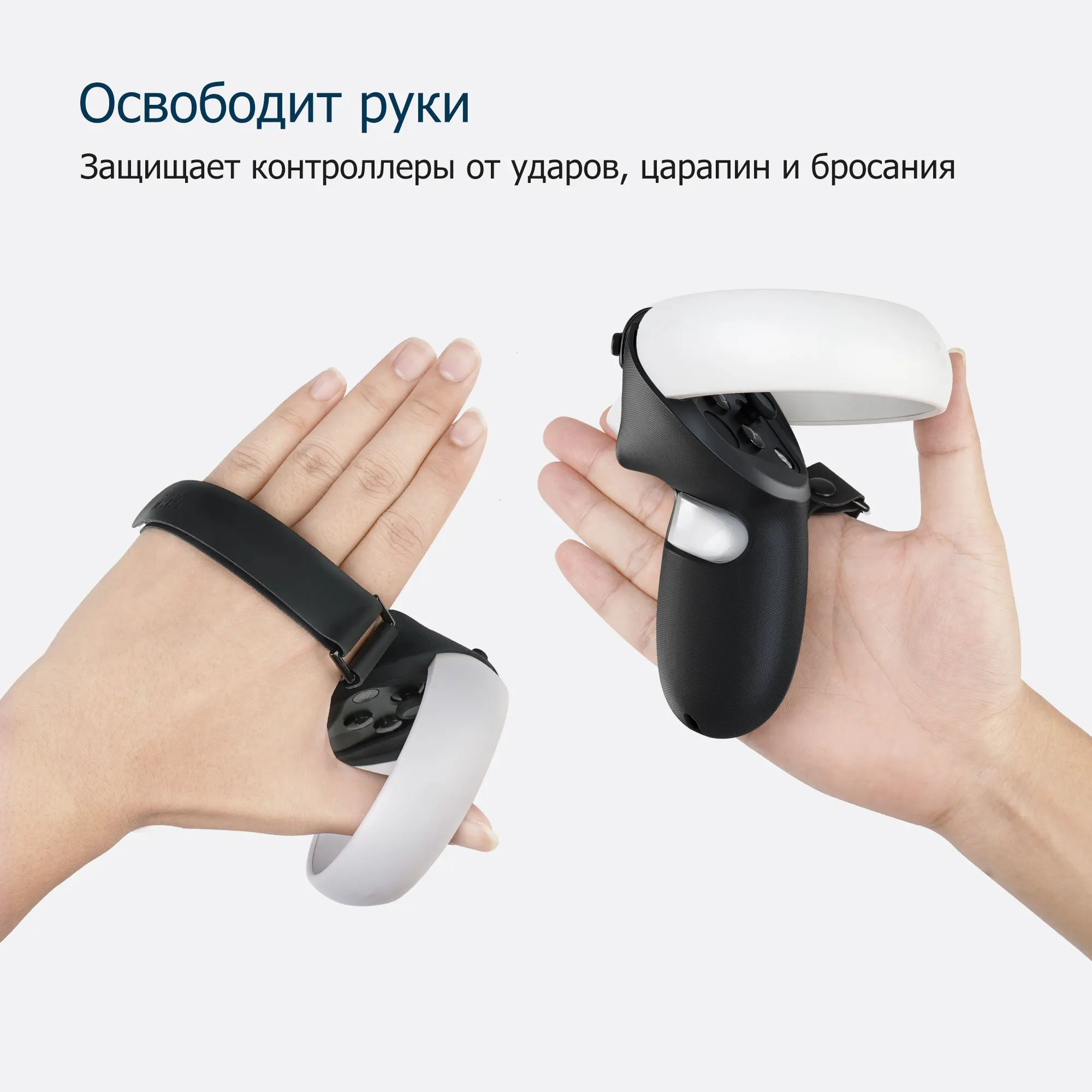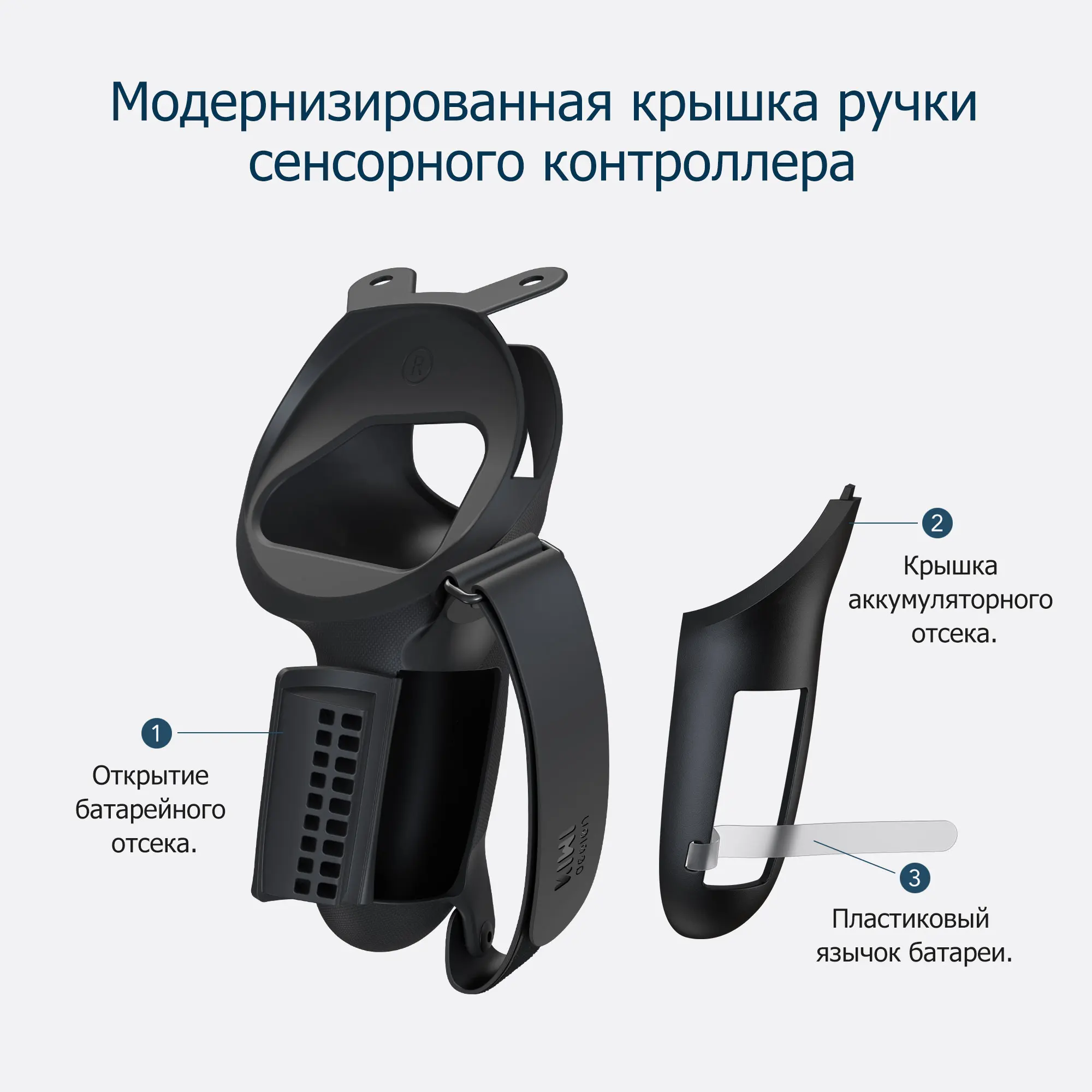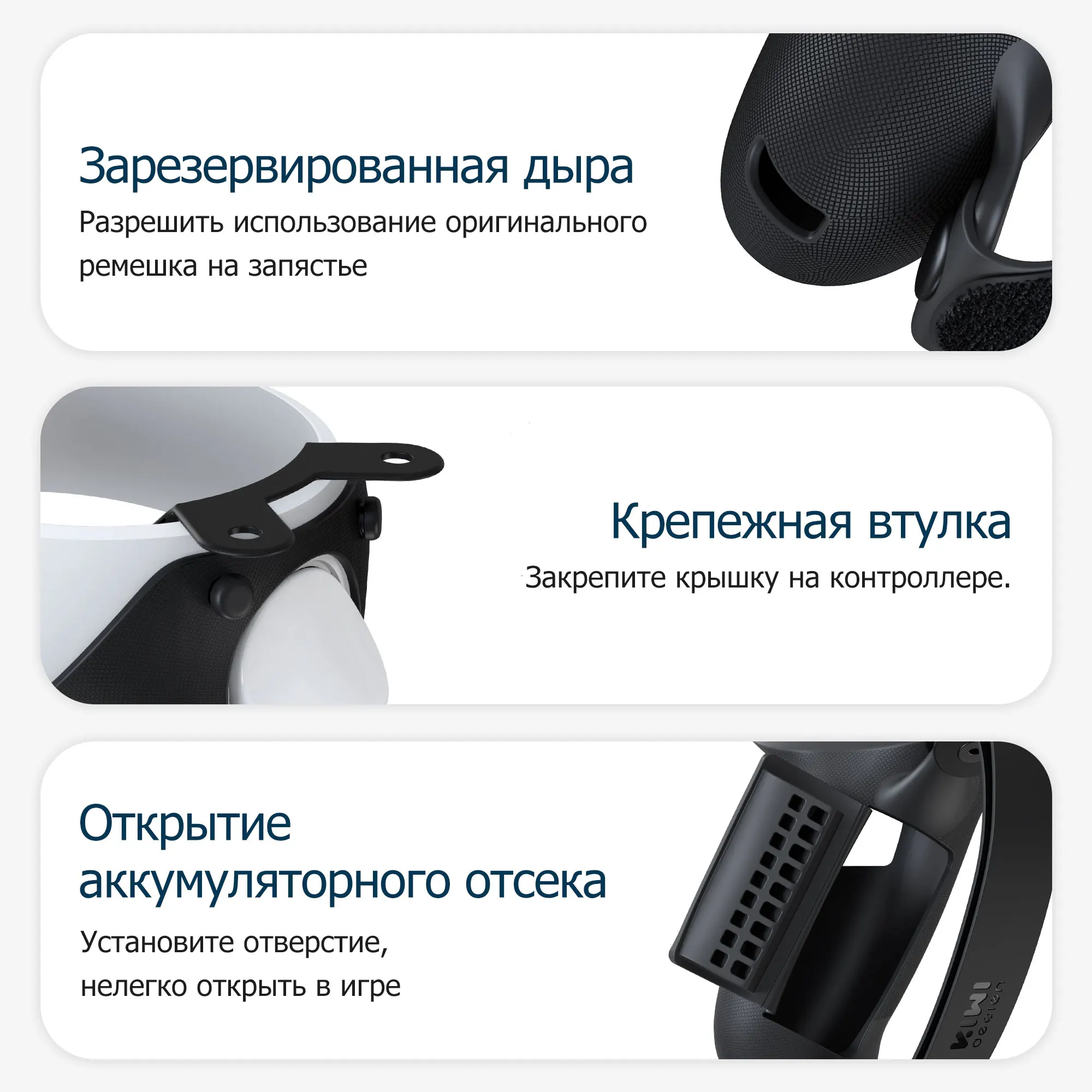 Отдельная конструкция позволяет легко встроить крышку ручки в контроллер или снять ее. Есть 2 фиксирующие пряжки, чтобы исправить это, не беспокойтесь о том, что при интенсивных упражнениях крышка ручки начнет отваливаться. В комплект поставки входят: 1 пара накладок на ручки сенсорного контроллера с ремешками для кулаков, 1 пара крышек батарейного отсека и 6 пластиковых язычков. Обратите внимание: аккумулятор в комплект не входит!