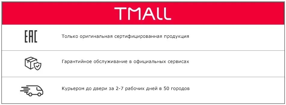 Гарантия качества | Вся продукция Tmall сертифицирована для продажи в России. |
