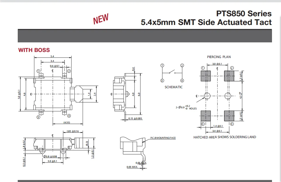 Импортируется из США C & K PTS850VM18PSMTRLFS большой сенсорный выключатель черепахи, горизонтальная Боковая кнопка, патч 4 фута, с фиксированной точкой в нижней части 5,4*5 мм, кнопка сила 1.8N, длительный срок службы, высокая термостойкость, склеивание и упаковка, с подробной информацией и чертежами размеров