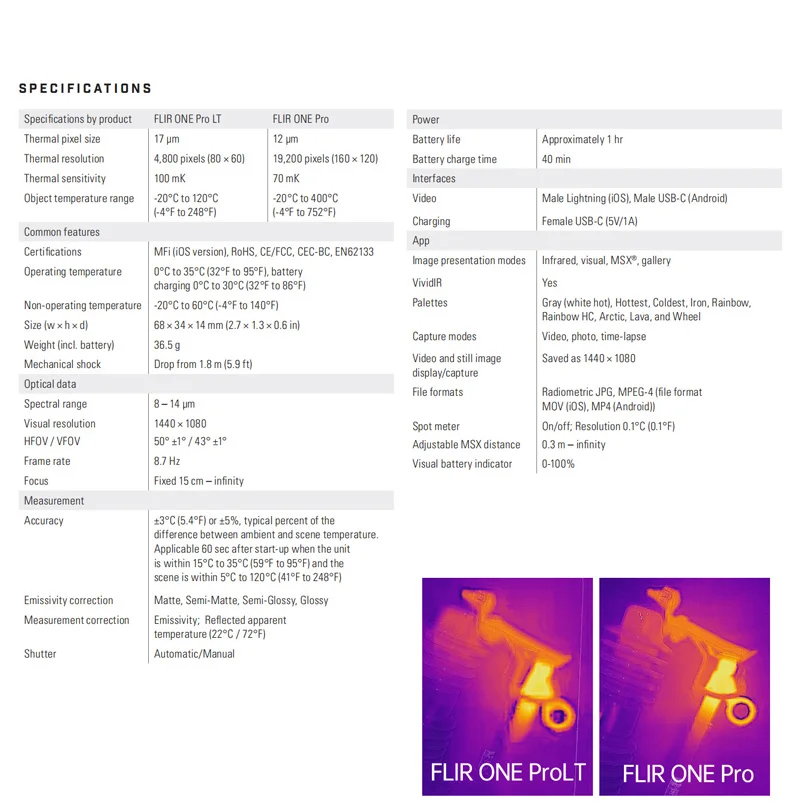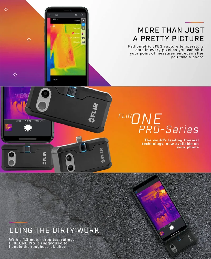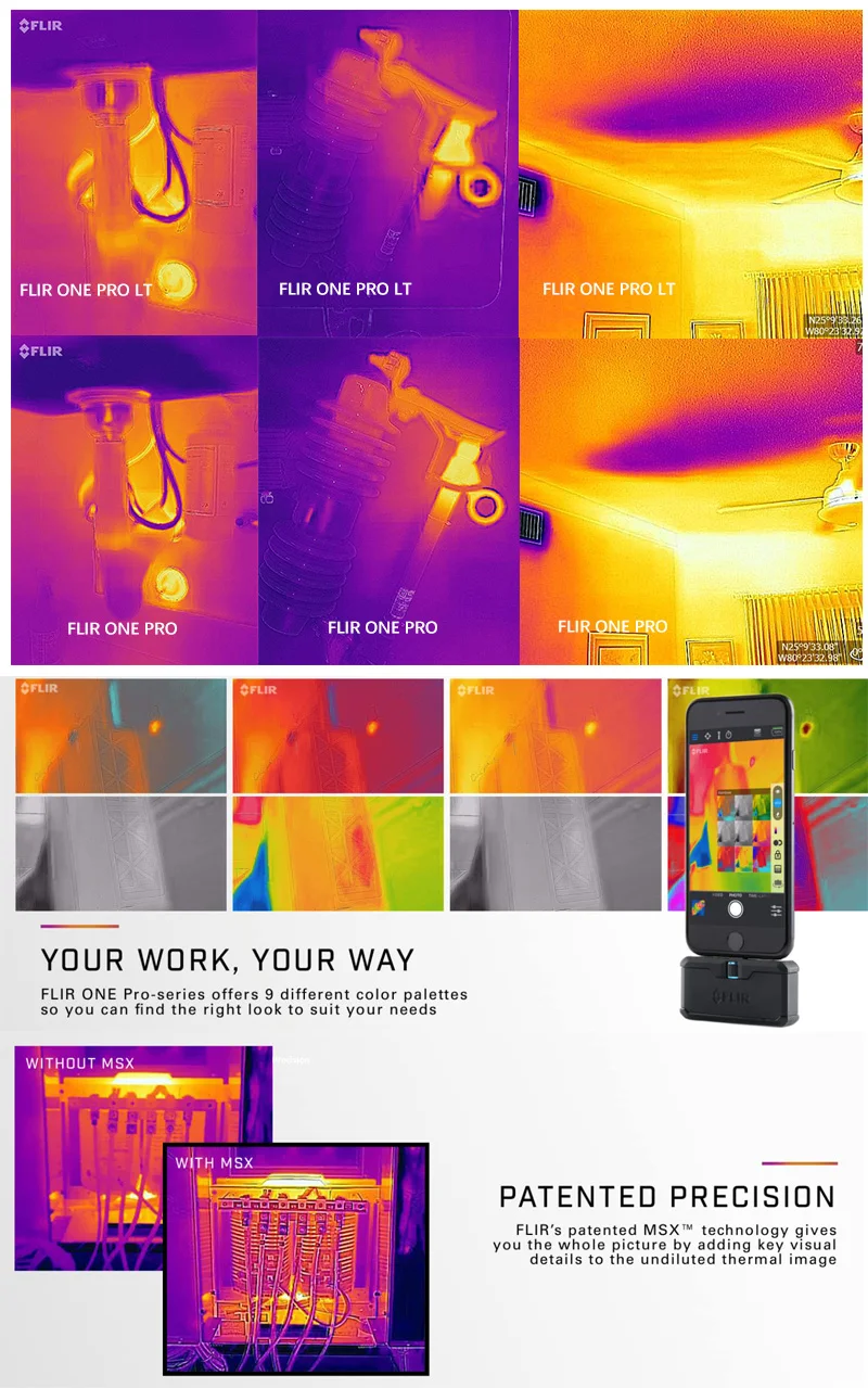 FLIR ONE Pro позволяет быстрее находить скрытые проблемы. FLIR ONE Pro может измерять температуру до 400 ℃, оснащен мощными измерительными инструментами, с первоклассным тепловым разрешением и его революционной обработкой изображений MSX и VividIR, может сделать почти всю тяжелую работу для вас. Независимо от того, проверяете ли распределительные платы, устраняете проблемы с ОВКВ или находите пятна воды, FLIR ONE Pro является незаменимым инструментом для профессионалов. Просто прикрепите FLIR one Pro к вашему iphone, android-телефону или планшету и превратите его в мощный тепловизор.