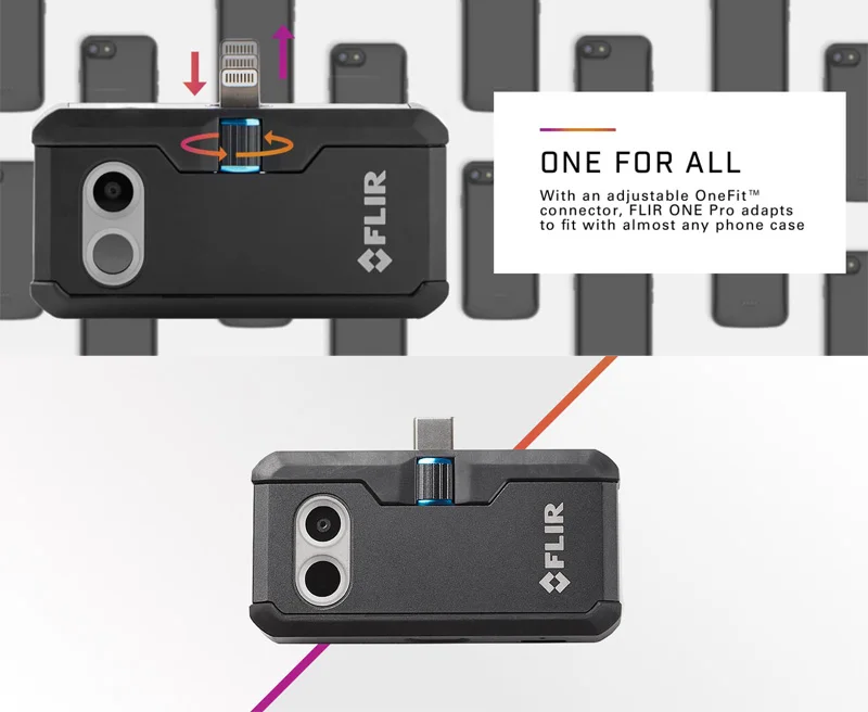 · Один Fit регулируемые разъем, распространяется на до 4-х никель-металл-миллиметра, чтобы вы могли скрепить ваш FLIR One Pro к вашему мобильному устройству, в то время как он по-прежнему в защитный чехол
