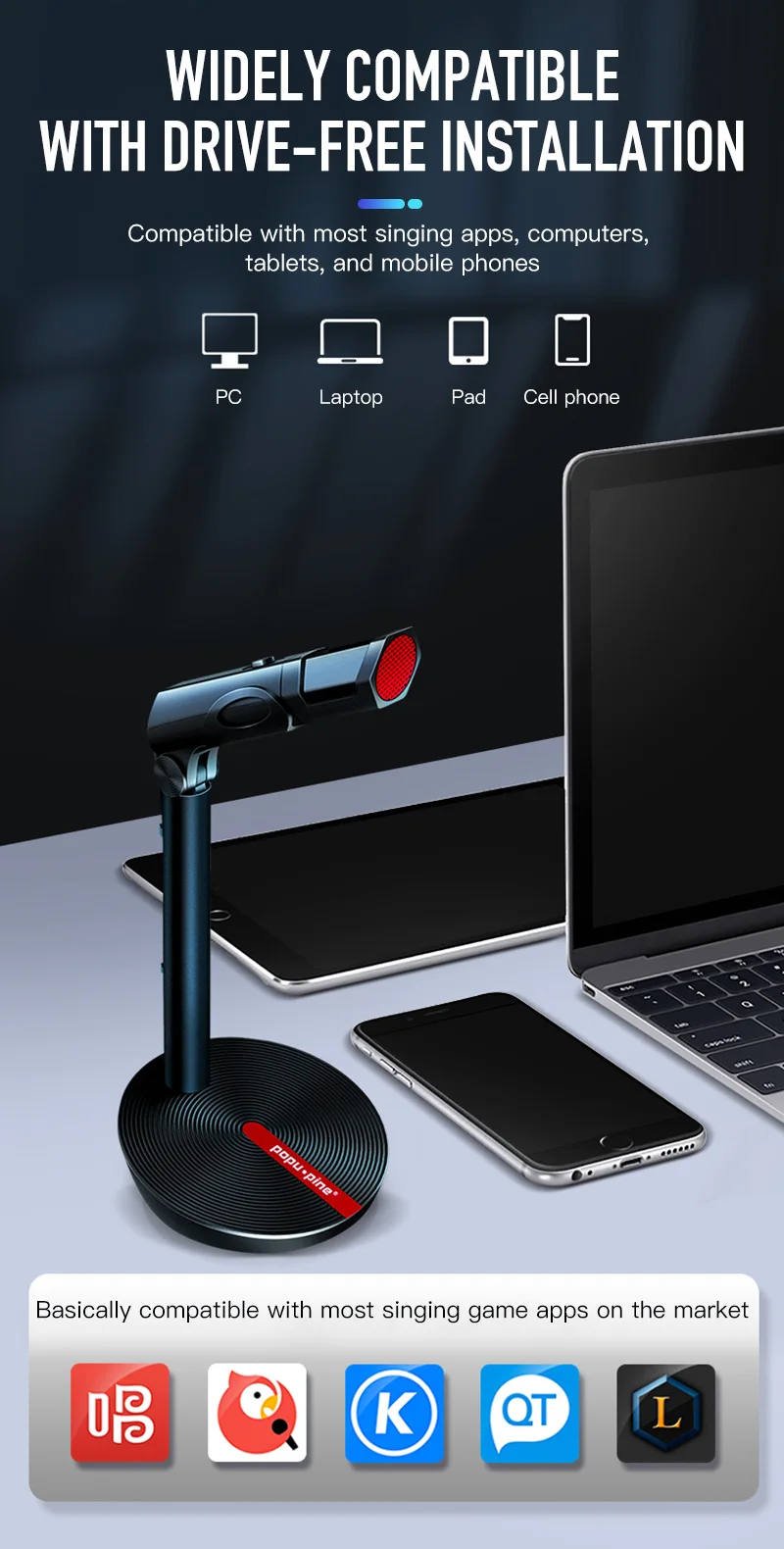 8.Aboue микрофон, мы используем дизайн текстуры Cd, делает его очень модным, и мы добавляем отягчающий блок, чтобы сделать держатель микрофона более стабильным, в то же время, В нижней части держателя имеется нескользящая подкладка для ног из ЭВА.