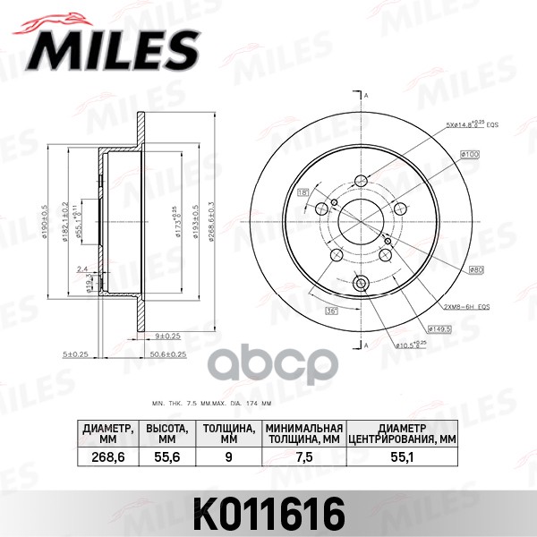 | Диск Тормозной Toyota Celica 1.8 99-/Prius 1.5 03-09 Задний D=269мм. Miles арт. K011616 | |