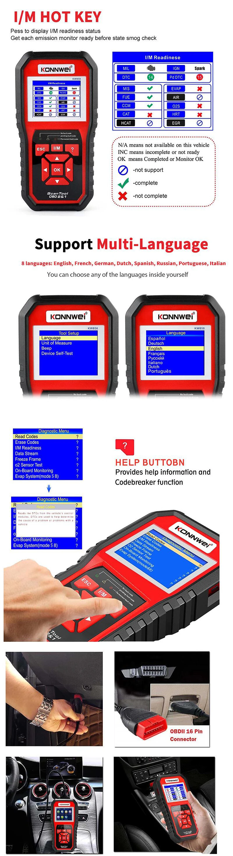 Сканер KONNWEI KW850 OBDII/EOBD поддерживает все 10 режимов тестирования OBDII для полной диагностики. Благодаря уникальной запатентованной клавише I/M, цветному tft-дисплею и встроенному динамику, KW850 действительно является конечной мощностью и доступностью, позволяет пользователям быстрее выполнять свою работу. Кроме того, тысячи советов по коду устранения неполадок помогают техникам экономить время диагностики и ремонта.