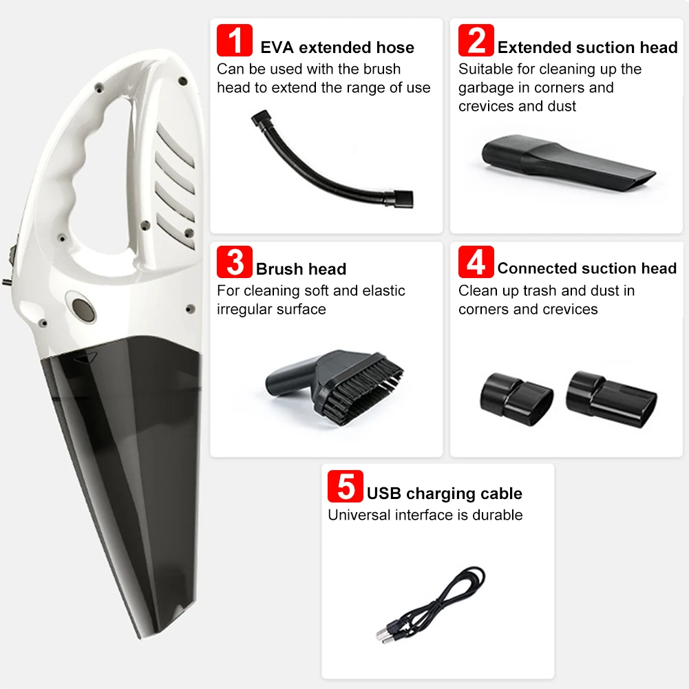 Ручной вакуум с 4 различными типами насадок. Щеточный инструмент может очищать волосы и грязь на ковре, диване или клавиатуре. Гибкий шланг для частиц пыли. Удлинительный щелевой инструмент для плотных углов или зазоров и может хорошо обрабатывать жидкости.