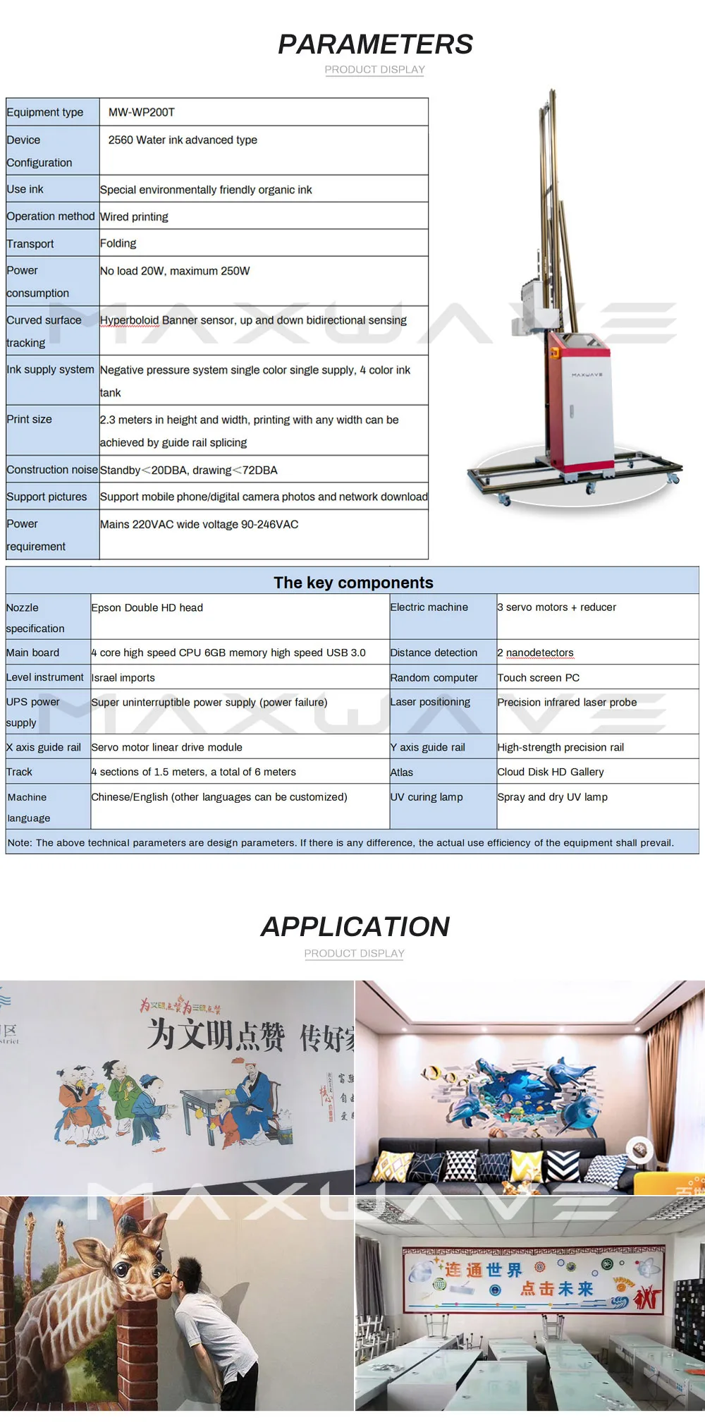 Для удовлетворения спроса клиентов на большинство широкоформатных принтеров Maxwave запустил новый горизонтальный настенный принтер. Это прямое к стене струйный принтер принимает импортированный Epson сопло из Японии. Картина четкая и яркая, конструкция машины гладкая, корпус машины съемный, портативный и простой в использовании. Эта машина применима к различным стеновым рисункам, таким как шпатлевка для стен, краска стен, стен плитки, диатомовая грязевая стена, холст, бумага и т. д.