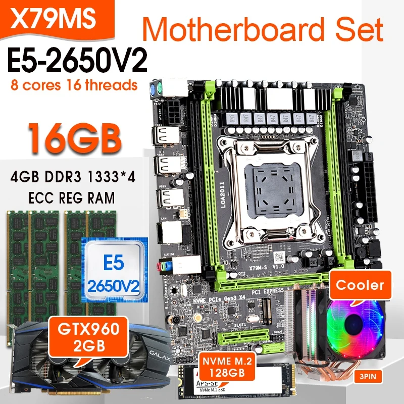 Our motherboard set includes the motherboard,1* CPU and 4*4GB RAM RECC.1*GTX960 2GB,1*NVME 128GB M.2,1*Cooler