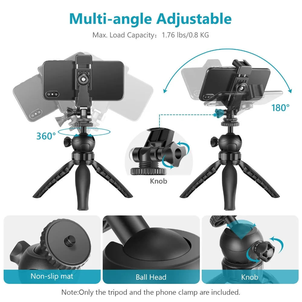 Примечание: Не Поворачивайте головку штатива напрямую, несколько прямых вращений головки штатива приведет к ослаблению; Пожалуйста, не устанавливайте камеры и другое большое оборудование на этом изделии, избегайте повреждения продукта из-за сложности балансировки. В комплект входят только мини-штатив и держатель для смартфона. Светодиодный светильник и микрофон в комплект не входят
