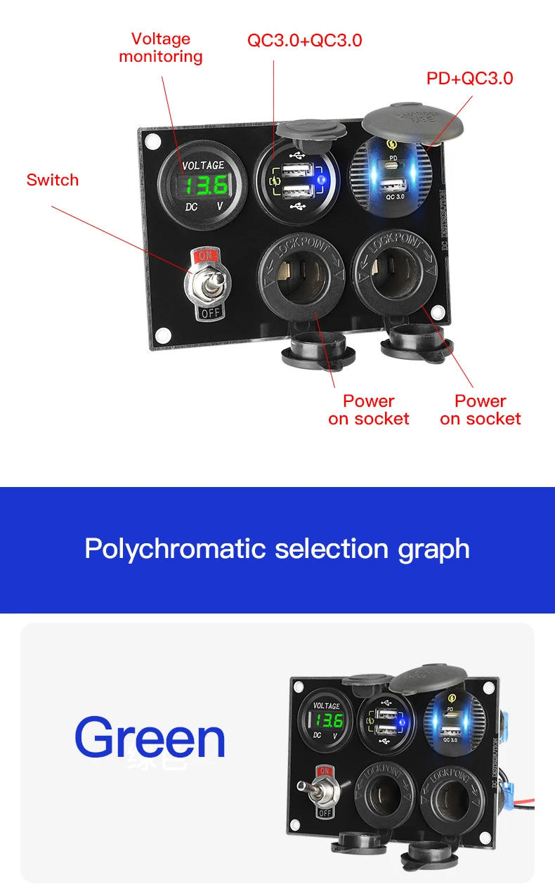 Основание панели с шестью отверстиями DIY; Двойная usb-розетка QC3.0 + usb-розетка QC3.0 и PD + Вольтметр + розетка 2*12 В + тумблер.