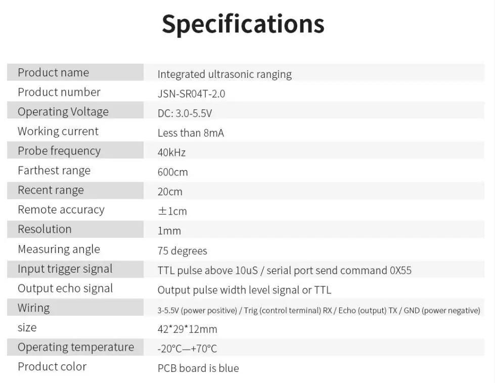 Использование этого модуля является простым, управление ртом сделало 10US выше высокого уровня, вы можете ждать приема высокоуровневого выхода. Выход может быть открыт время таймера, когда рот становится низким, когда вы можете прочитать значение таймера, на этот раз для расстояния времени, можно рассчитать расстояние. Такое измерение непрерывного цикла, которое можно измерить для достижения значения вашего перемещения.