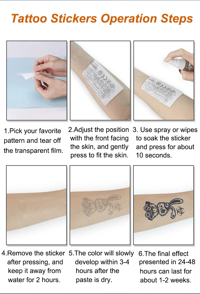 2. Не прикасайтесь к открытой коже в течение длительного времени после нанесения тату-наклейки, в противном случае она будет напечатана на других шкурах.