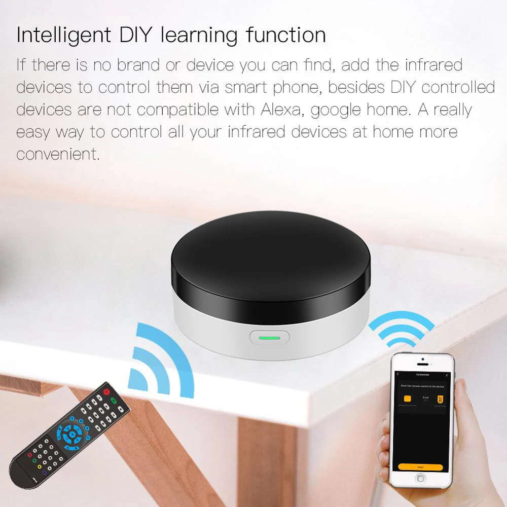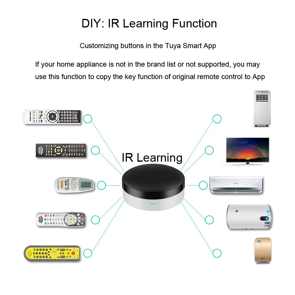 Умный шлюз bluetooth buit в универсальном ИК-пульте дистанционного управления и RF433, вы можете использовать свой мобильный телефон для управления бытовой техникой, такой как STB (телеприставка), TV Box, TV, кондиционер, вентилятор, DVD и т. Д. Совместимость с большинством брендов на рынке, для подробной информации, Пожалуйста, обратитесь к списку поддерживаемых брендов в приложении. Кроме того, у него есть функция обучения, Позволяет Копировать функцию ключа оригинального пульта дистанционного управления в приложение (Настройка кнопок в умном приложении Tuya). Вы также можете скопировать пульт дистанционного управления RF433 для реализации продукта, который контролирует беспроводной пульт дистанционного управления RF433. Функция шлюза Bluetooth позволяет подключать умные переключатели и умные устройства сетки Bluetooth SIG.