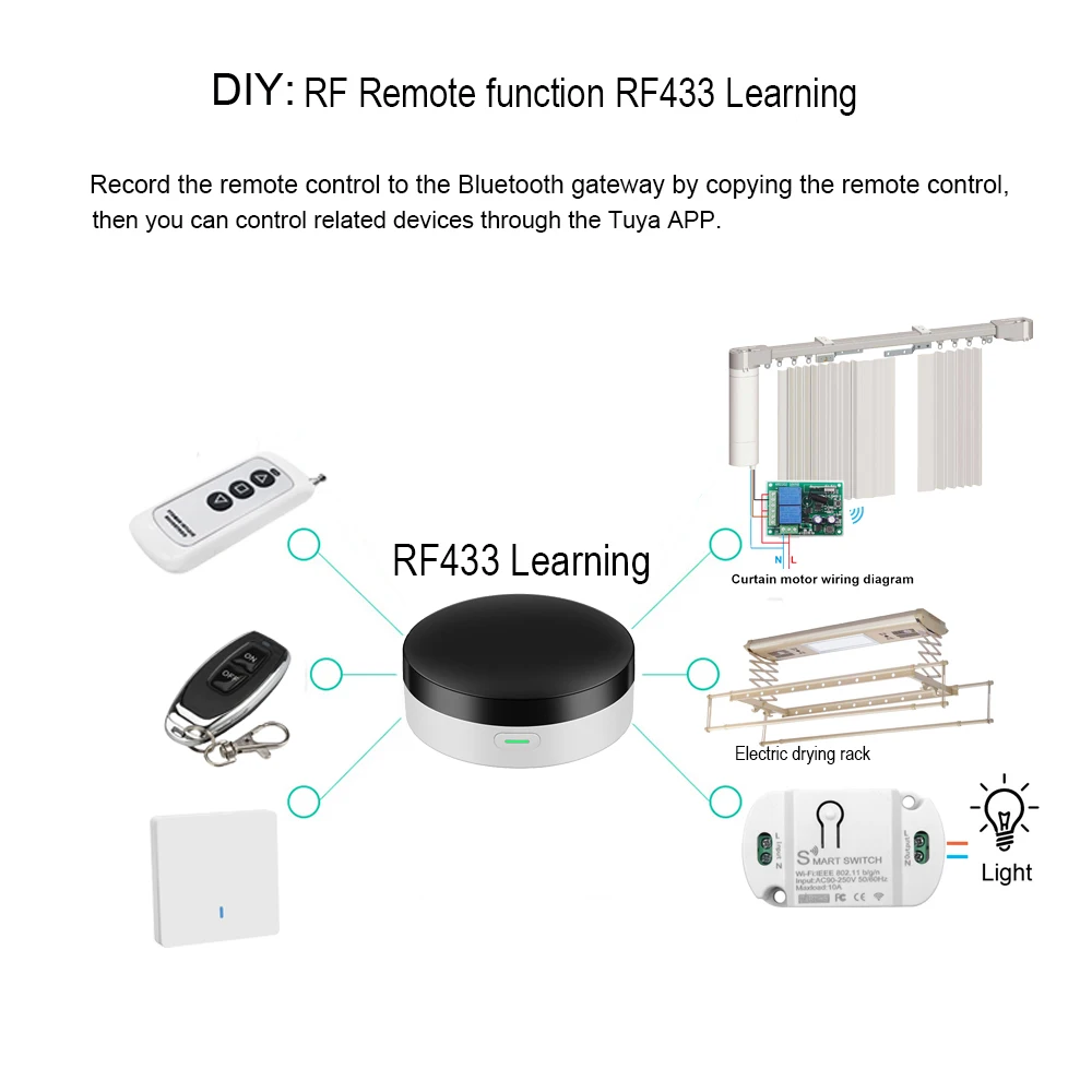 Умный шлюз Bluetooth имеет функцию копирования, которая может Копировать Пульт дистанционного управления частотой theRF433 EV1527chip для удаленного управления коммутационным оборудованием RF433.
