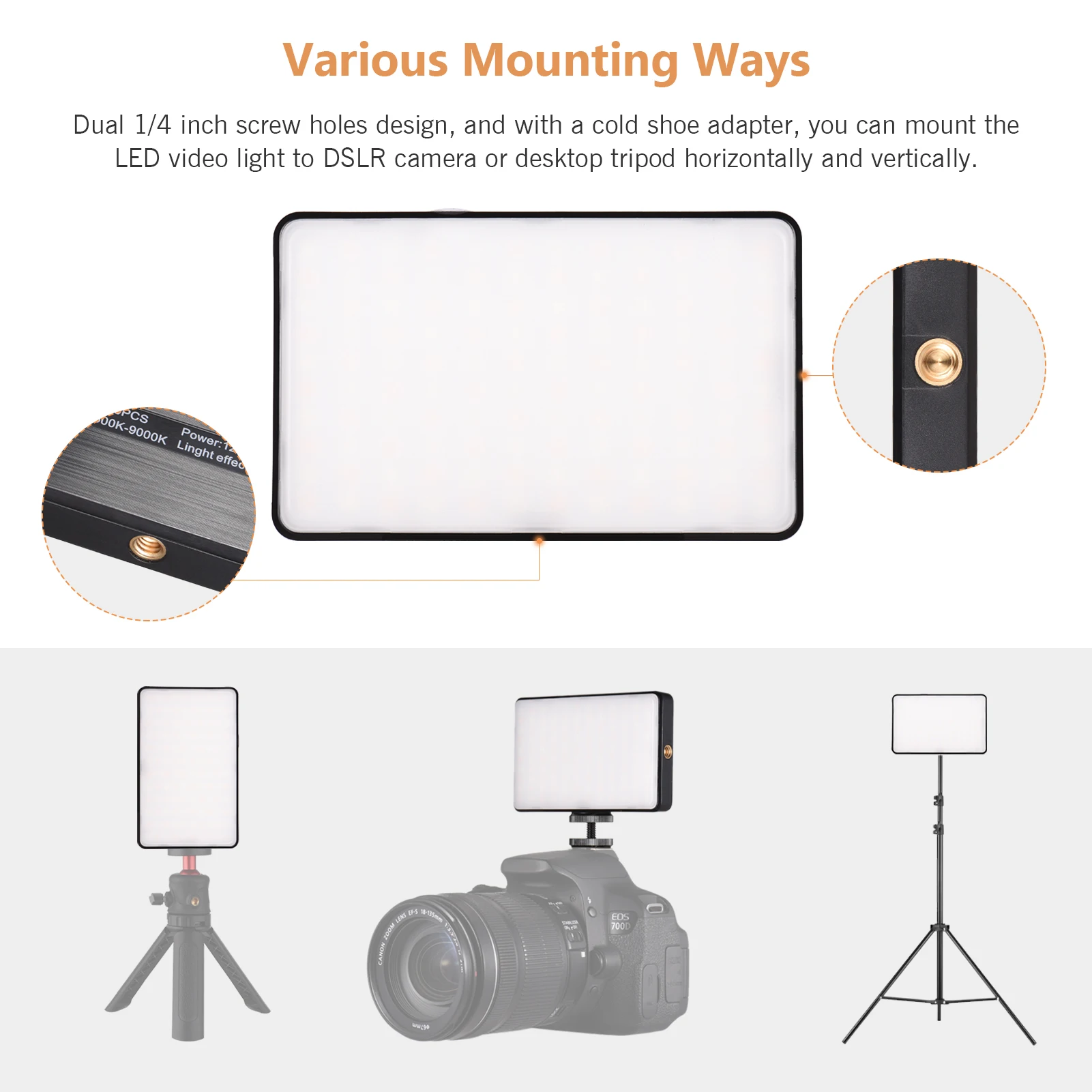 Двойная конструкция с резьбовыми отверстиями 1/4 дюйма, а также с адаптером для холодной обуви, вы можете установить светодиодный светильник для видеокамеры DSLR или настольного штатива по горизонтали и вертикали.