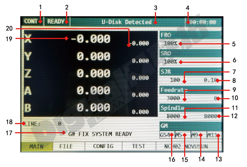 Строка состояния файла отображает информацию о загрузке кода G или состоянии u-диска и отображает «без загрузки файла», когда нет загруженного файла; «U-диск обнаружен», когда u-диск вставлен и правильно идентифицирован; «u-диск удален», когда U диск вытягивается;» G кодовое имя файла ", когда код G правильно загружен;