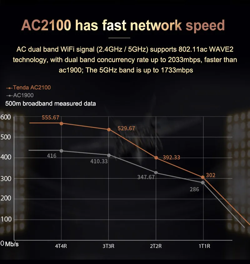 С 7*6 dBi внешними антеннами и четырьмя потоками данных диапазона 5 ГГц, AC23 может обеспечить оптимизированное покрытие Wi-Fi и лучший сигнал WiFi 5 ГГц.