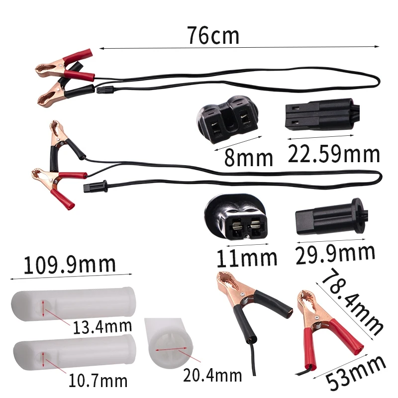 Посылка включает в себя две белые трубки и два зажимного кабеля зарядного устройства для двух инжекторов разного размера.