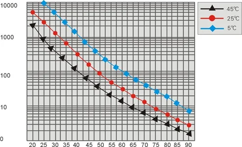 60% RH | 105K | 80K | 62K | 50K | 39K | 31K | 25K | 20K | 17,5 K | 15K | 13K | 11K | 9,4 K |