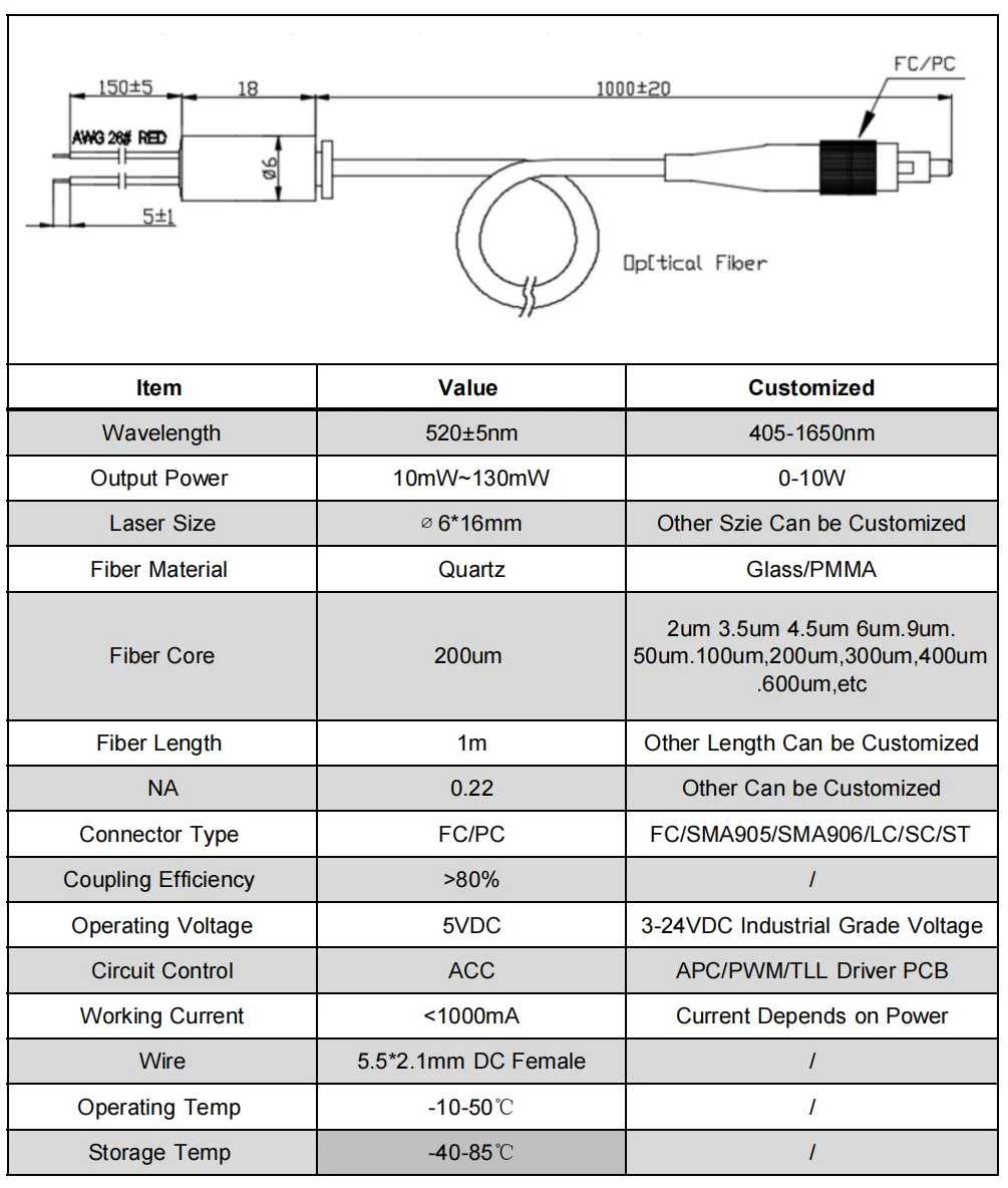 AIKE 200um Multimode 520nm 10mW ~ 130mW зеленое волокно в сочетании с APC Драйвером