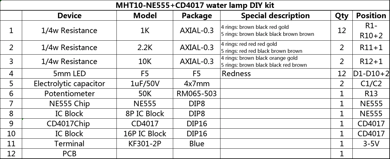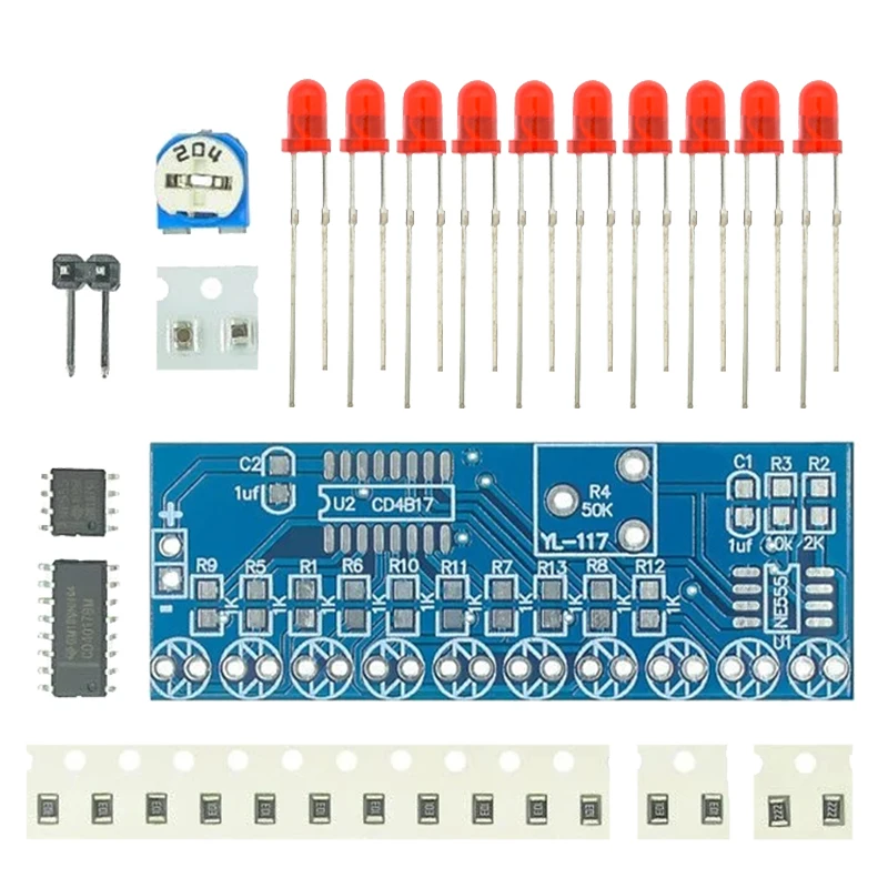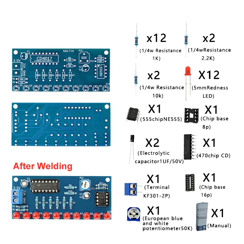 После включения питания, у нас работает 10 светодиодов будет светильник вверх последовательно слева направо, включает в себя информацию о состоянии Бег светильник s. Этот набор может отображать время NE555 и CD4017 счетные функции интуитивно. Это стартовый набор для обучения таймеров, счетчиков, частотных разделителей и контроллеров фонарей. В то же время комплект имеет хорошие эффекты, очень интересный и практичный, а также является предпочтительным материалом для начинающих.