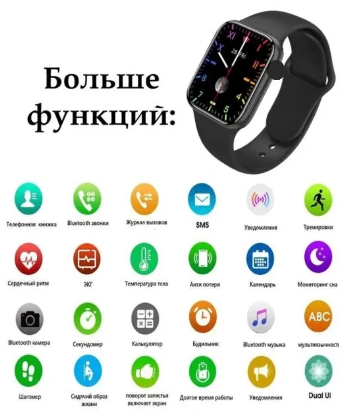 Смарт часы имеют квадратный циферблат, который подходит как для мужчин, так и для женщин. Размер – 44,1 мм*37,9 мм * 13,5 мм, вес 35г.