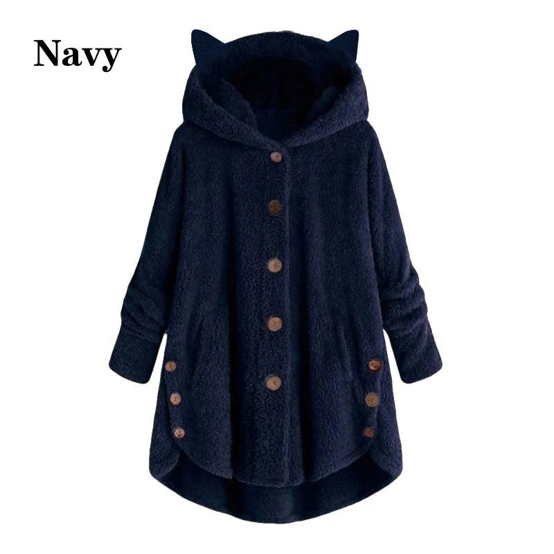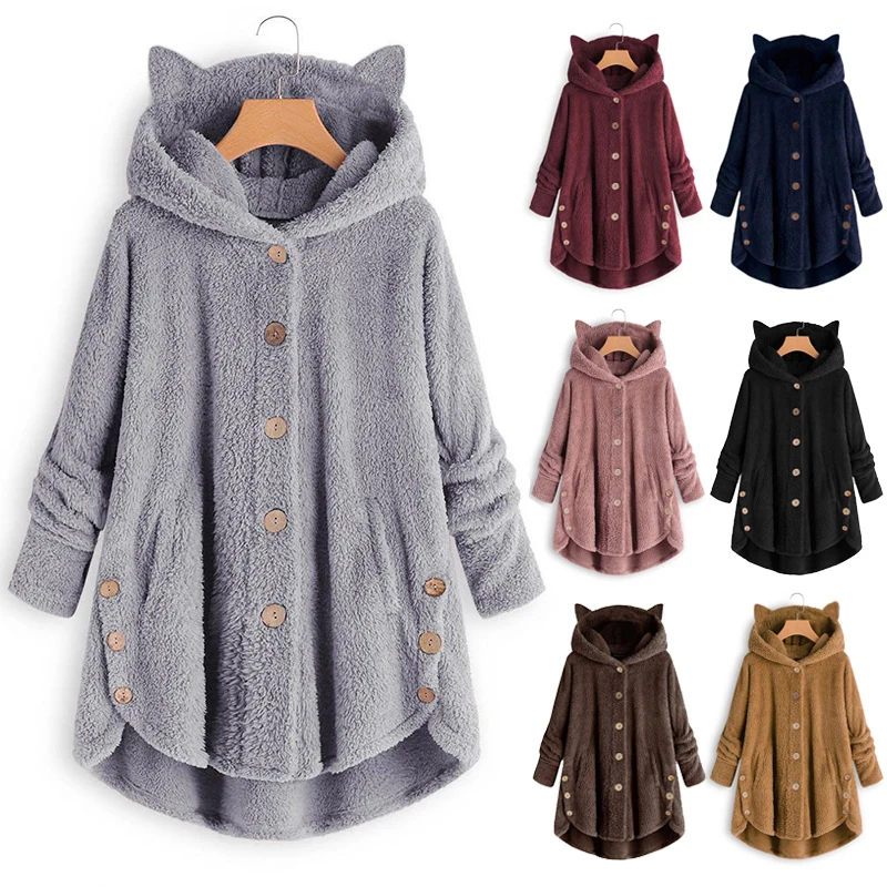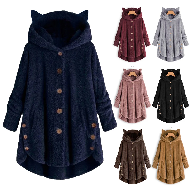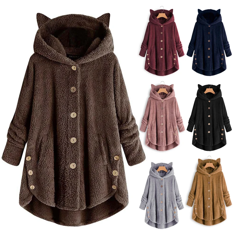 Осенне-зимнее плюшевое теплое пальто на пуговицах с капюшоном и кошачьими ушками, модное Брендовое однотонное пальто большого размера для женщин