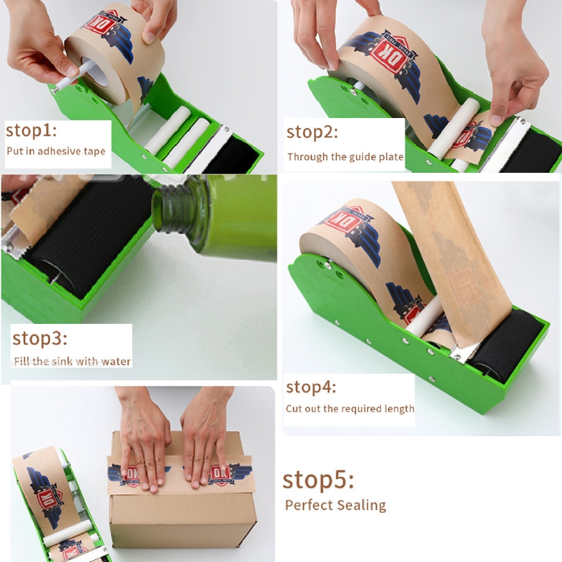 Характеристики: 1. Диспенсер с водно-активированной лентой, который может быть эффективно применен к коробкам для доставки на упаковочных заводах, офисах, больших торговых центрах, розничных магазинах и супермаркетах.