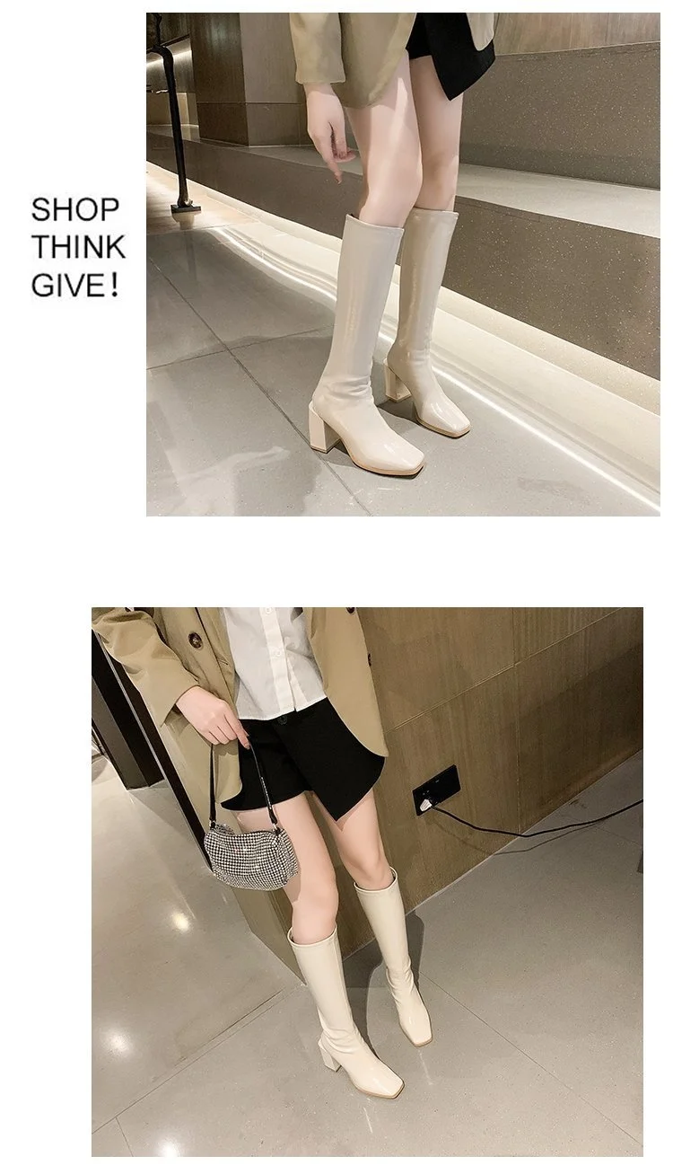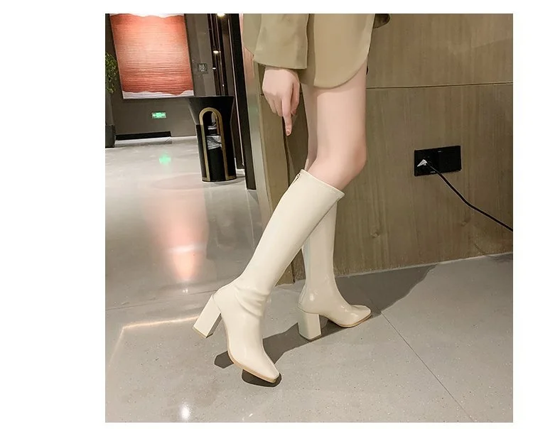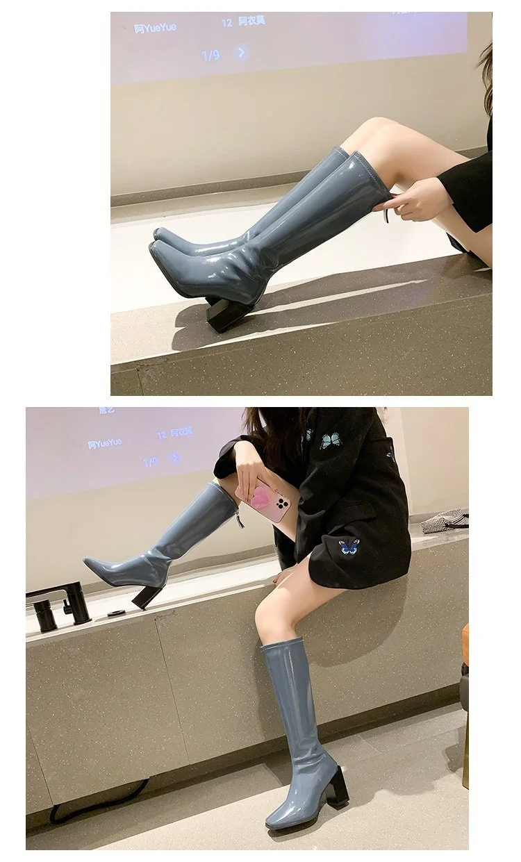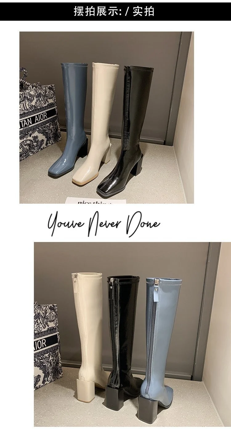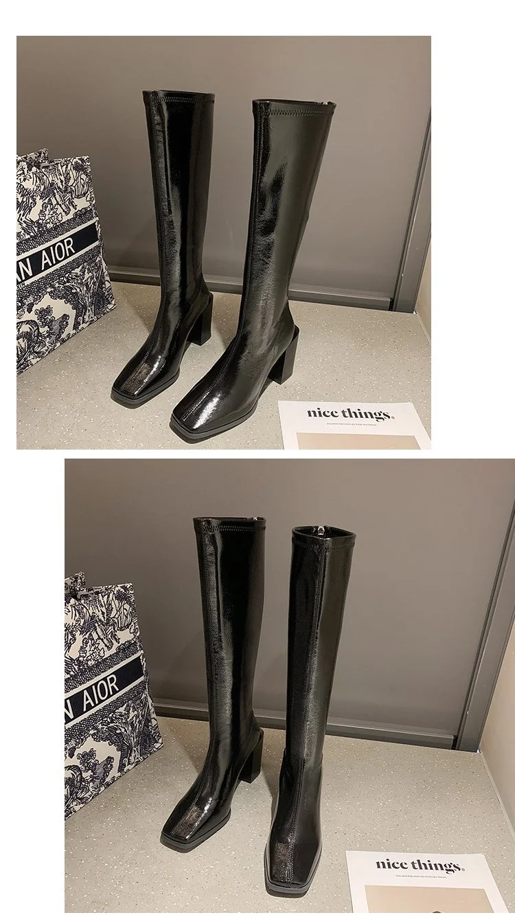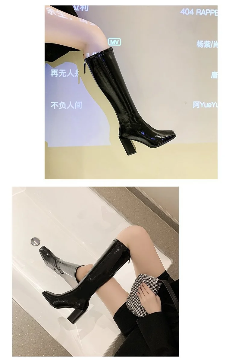 Женские лакированные кожаные сапоги до колена новинка зимы 2021 теплые высокие на
