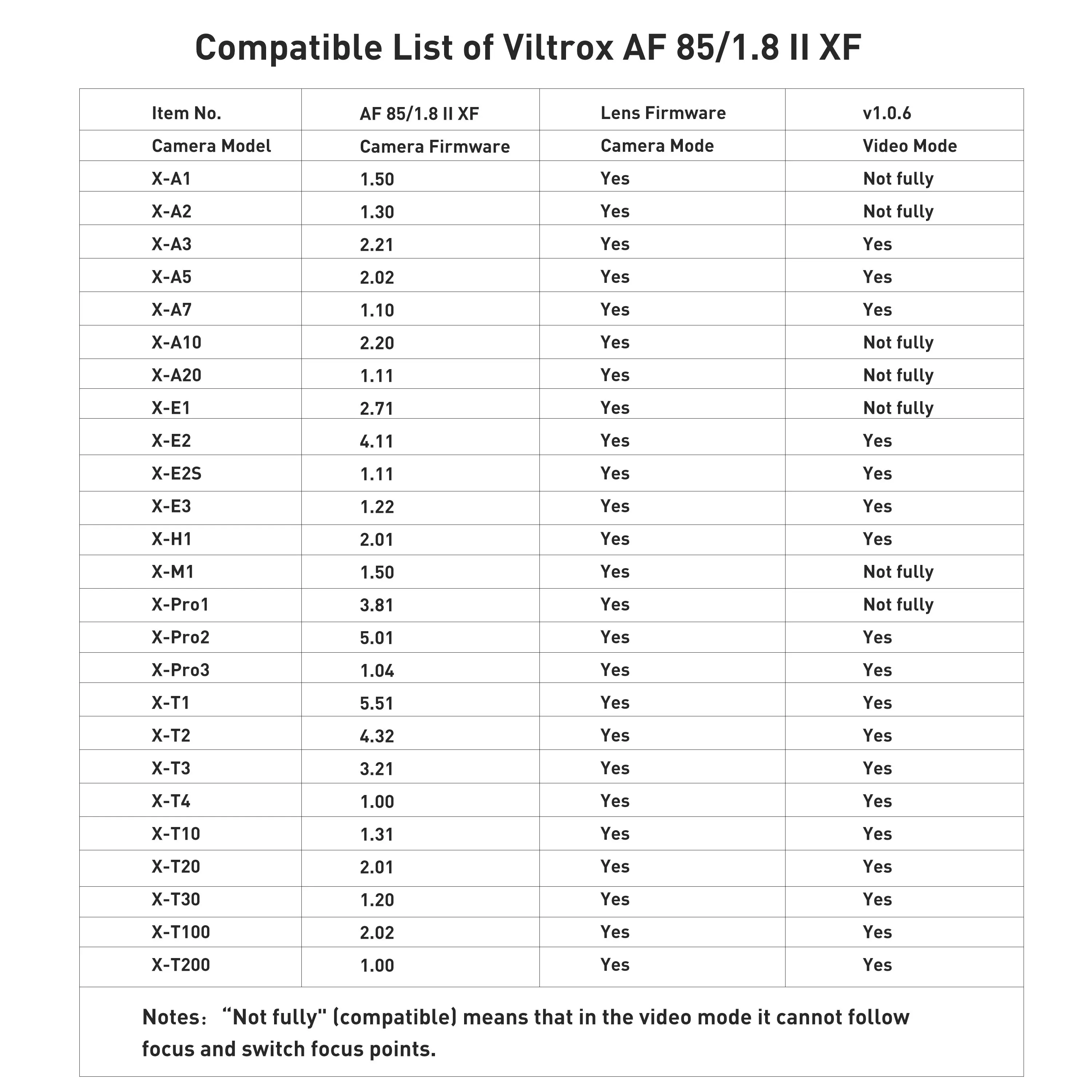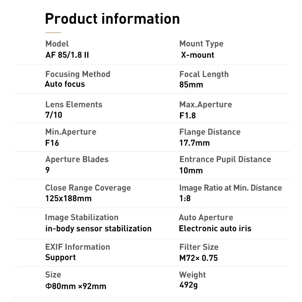 Lens type:Fixed focus lens Focus method:Auto Focus Filter size:72mm Compatibility camera: Fuji X-mount camera Focal length:85mm Aperture:F1.8-F16 Optical structure: 10 Elements in 7 Groups, including 1* ED glass and 4* low wave height of the lens sheet Aperture Blades: 9 Focusing distance: 0.8m~∞ Flange distance: 17.7mm EXIF Information: Support Auto Focus:Support(Focus Peaking+PDAF) Object distance image ratio: 1:8 Auto iris:electronics Image stabilization: Support in-camera stabilization Weight: 492g (1.08lb)