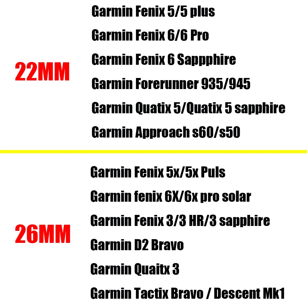 Подходит для:20 мм:Смарт-часы для Garmin Fenix 5S PlusДля Garmin Fenix 5SДля Garmin Fenix 6S Pro22 мм:Для Garmin Fenix 5 GPS / Glonass спортивные часыДля Garmin Fenix 5 Sapphire Premium GPS / Glonass мульти спортивные часыДля Garmin Forerunner 935 GPS бег/Триатлон часыДля Garmin Approach S60Для Garmin Fenix 6Для Garmin Fenix 6 Pro26 мм:Для Garmin D2 Charlie Garmin Descent Mk1Для Garmin Fenix 5X Multisport GPS тренировочные часыДля Garmin Fenix 6XДля Garmin Fenix 6X ProДля Garmin Fenix 3Для Garmin Fenix 3 HRДля Garmin Fenix 3 SapphireДля Garmin D2 Bravo часы в авиационном стиле GPS часы/D2 CharlieДля Garmin Descent Mk1Для Garmin Quatix 3 морские GPS умные часыДля Garmin tactix Bravo GPS Multisport WatchУпаковка:1 * Сменный ремешок (часы в комплект не входят)