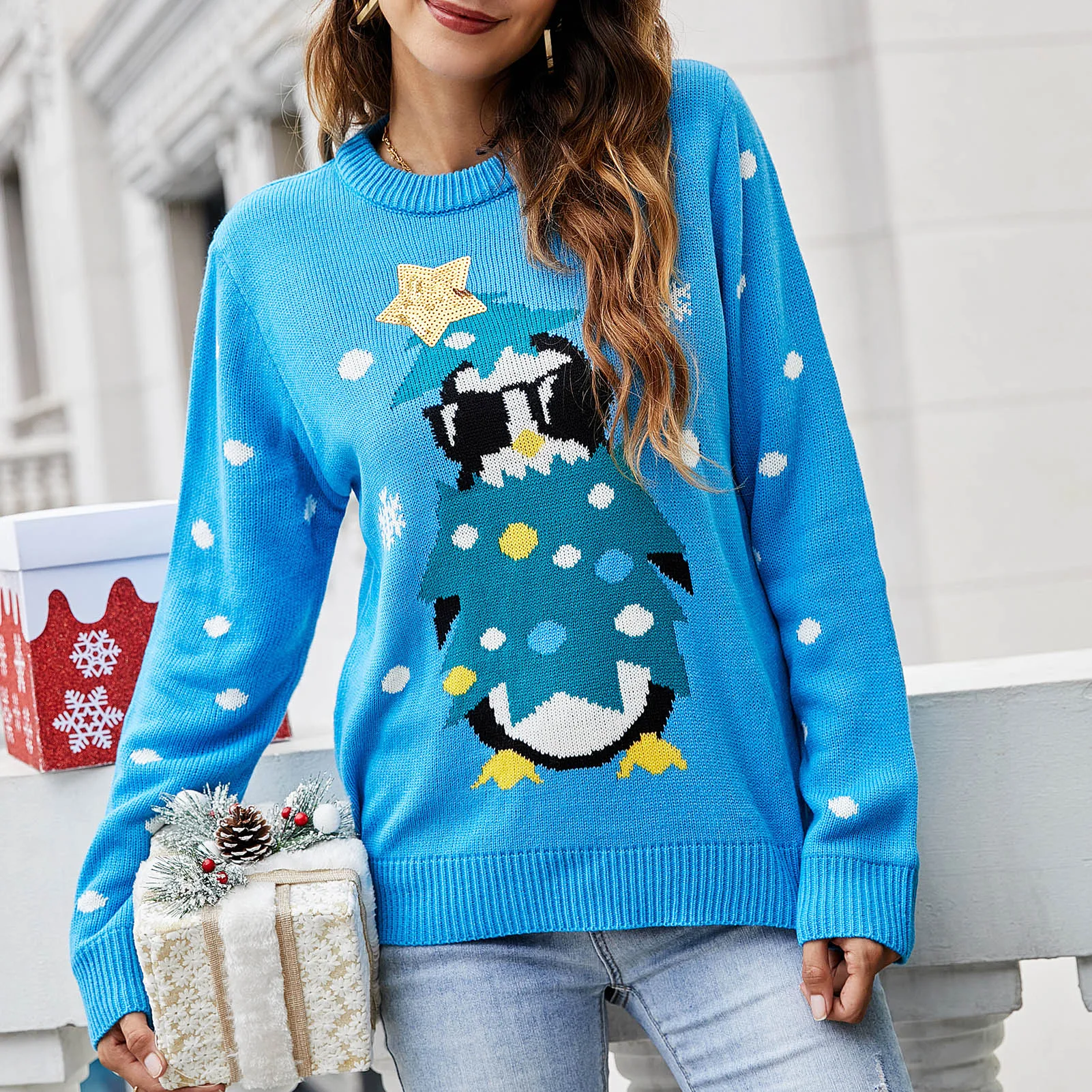Вязаный свитер с рисунком пингвина и снежинки очень восхитительный. С круглым вырезом и длинными рукавами; В повседневном стиле. Есть один, который сохраняет тепло зимой!