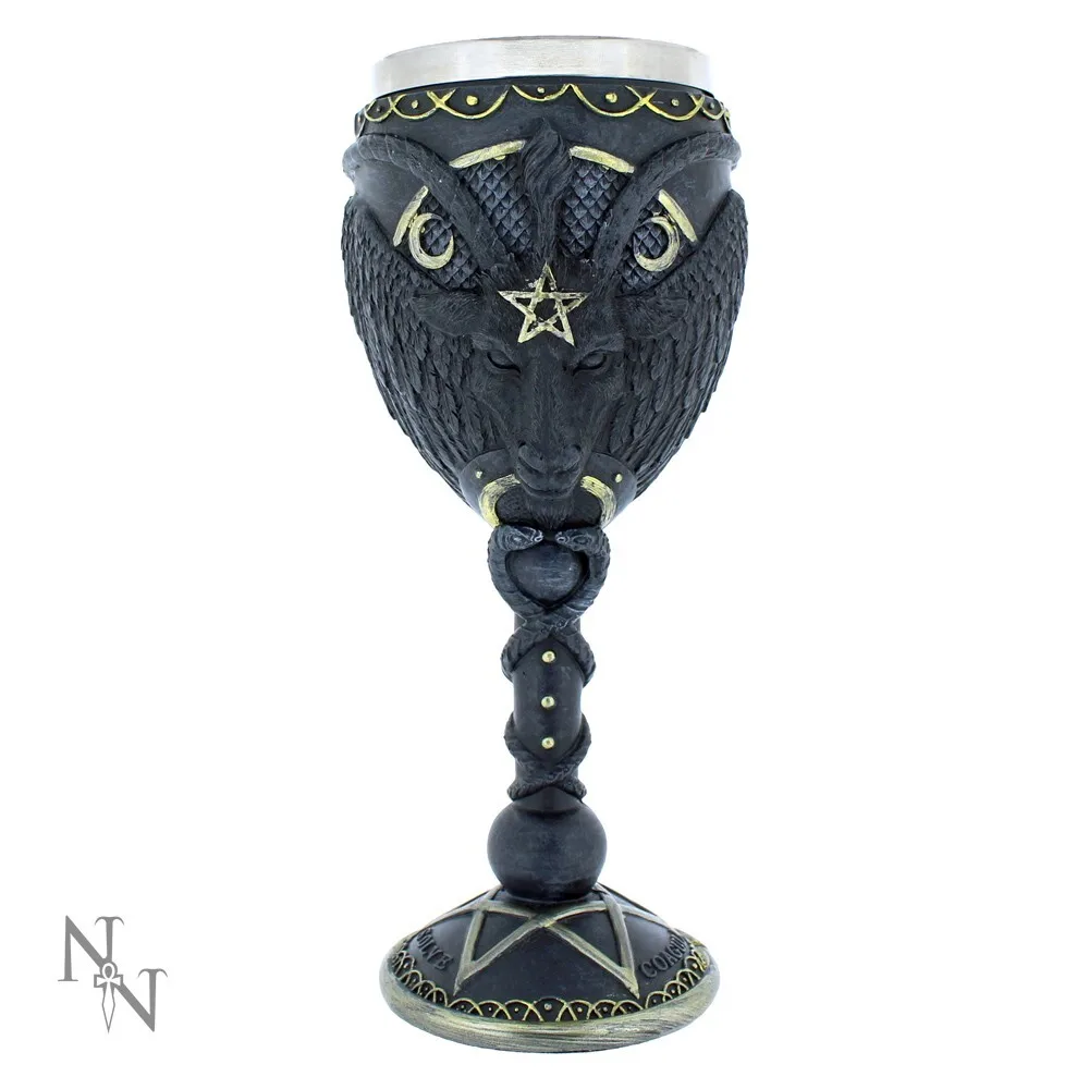 Этот оккультный кубок появился благодаря воображению команды дизайнеров бренда Nemesis Now. На одной стороне кубка изображена голова трехрогого козла с золотой пентаграммой на черепе. Над головой расположена пара золотых полумесяцев, а под ней - головы двух королевских кобр, готовых к нападению. Позади Бафомета находится пара крыльев, которые огибают чашу с другой стороны, где они сходятся и увенчиваются пентаграммой. Стебли превращаются в основание пентаграммы, на котором написаны слова "Solve" и "Coagula". Отлитый из тончайшего полистоуна смолы и тщательно расписанный вручную, этот предмет станет прекрасным дополнением любого готического дома и поставляется со вставкой из нержавеющей стали для удобства чистки. Предназначен для использования по прямому назначению, а так же в декоративных целях. Мыть только вручную. Объем бокала - 200 гр.