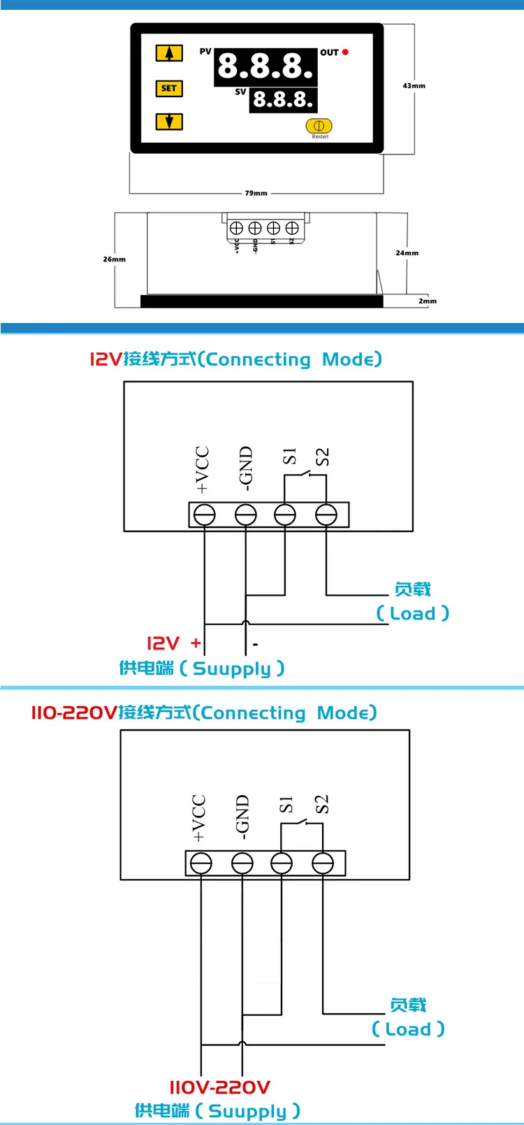 Инструкции:Подключите источник питания и оборудование для питания к контроллеру. В это время он отображается как измерение температуры. Нажмите один раз, температура дисплея мигнет, нажмите +-чтобы установить желаемую температуру (нажмите +-чтобы быстро поднять и снизить) после окончания, нажмите кнопку SET, чтобы подтвердить возврат. В это время контроллер автоматически выполняет реле Вкл/Выкл в соответствии с настройками! Выход термостата представляет собой реле 20A, которое удовлетворяет различные мощные нагрузки. Когда цепь управления подключена, термостат может быть приведен в действие. В это время на дисплее отображается температура окружающей среды.