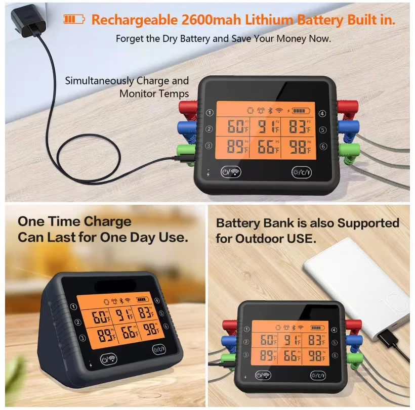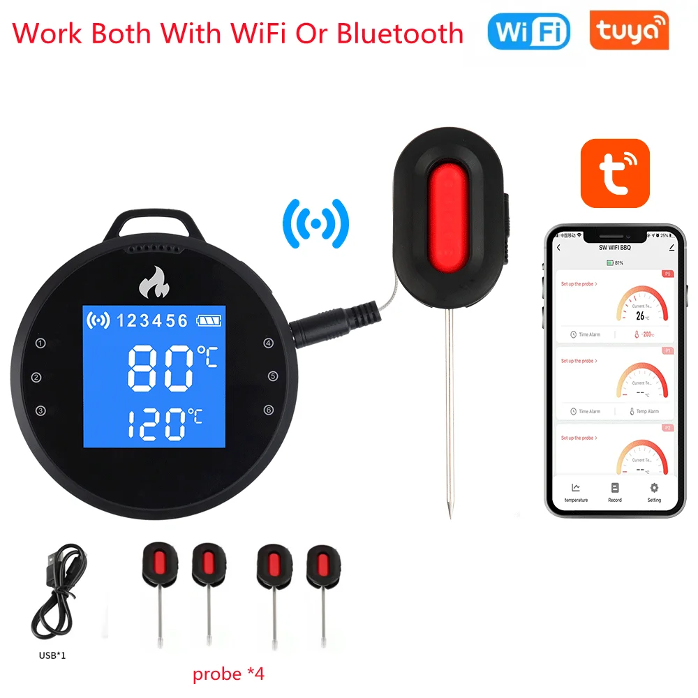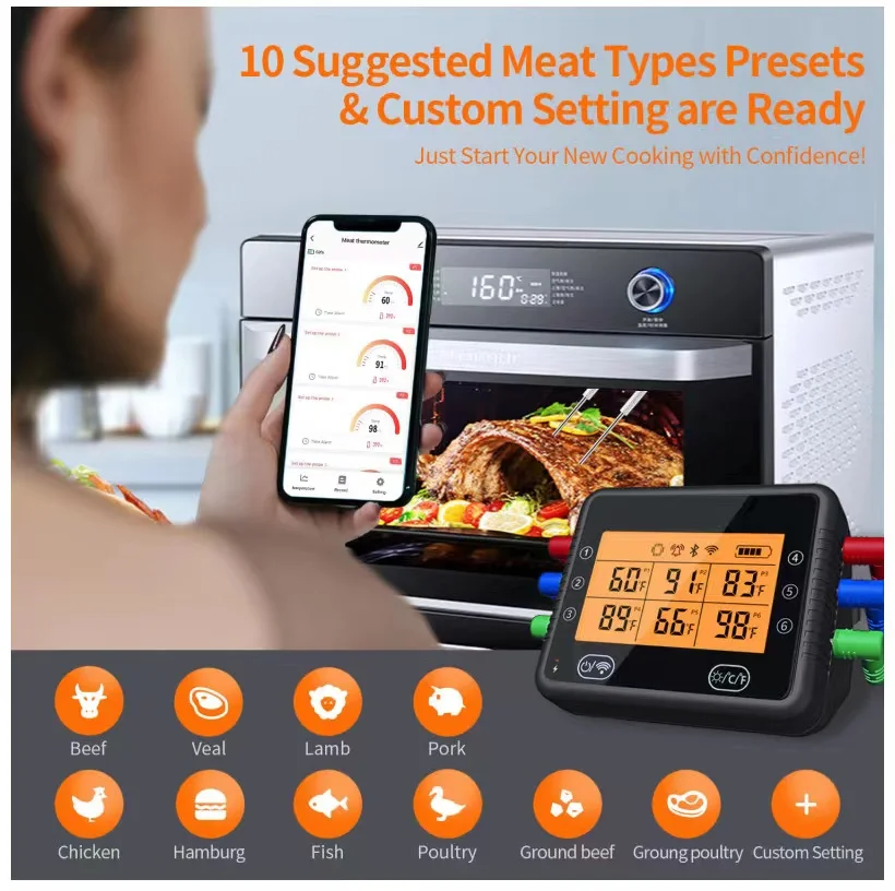 Перезаряжаемый Wifi термометр для барбекю для кухни, приготовления пищи, пульт дистанционного управления, беспроводной термометр для барбекю с шестью зондами и таймером для барбекю, курильщика, печи, мяса, гриля