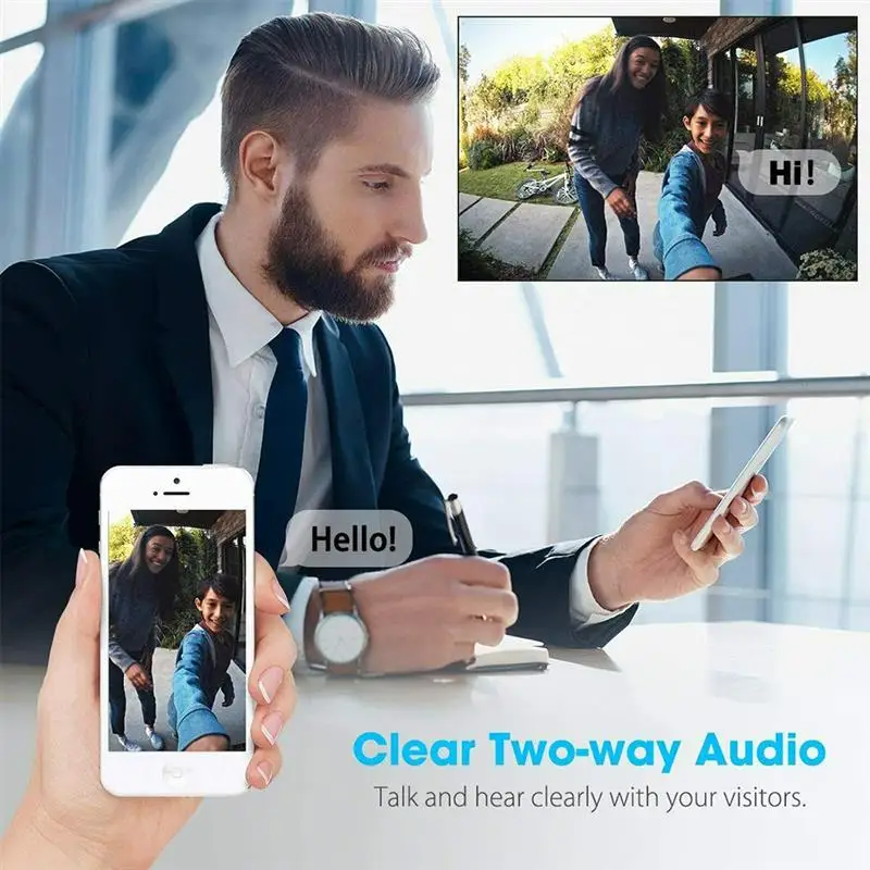 Дверной видеодомофон поддерживает двухстороннее аудио, когда кто-то нажимает дверной звонок или PIR обнаруживает сигнализацию, ваше мобильное приложение получит сигнал тревоги видео звонок напрямую, вы можете просто ответить на звонок, чтобы увидеть видео звонок прямо из вашего мобильного приложения и поговорить в режиме реального времени.