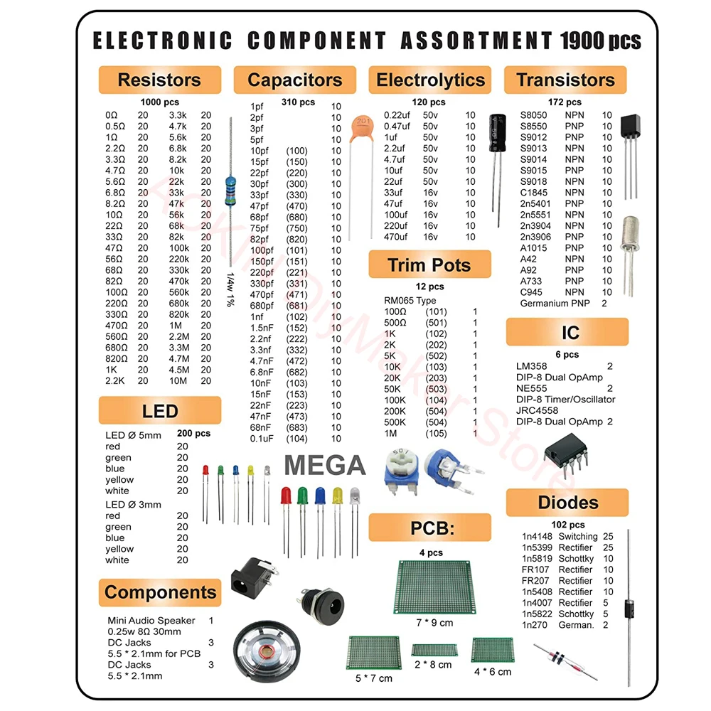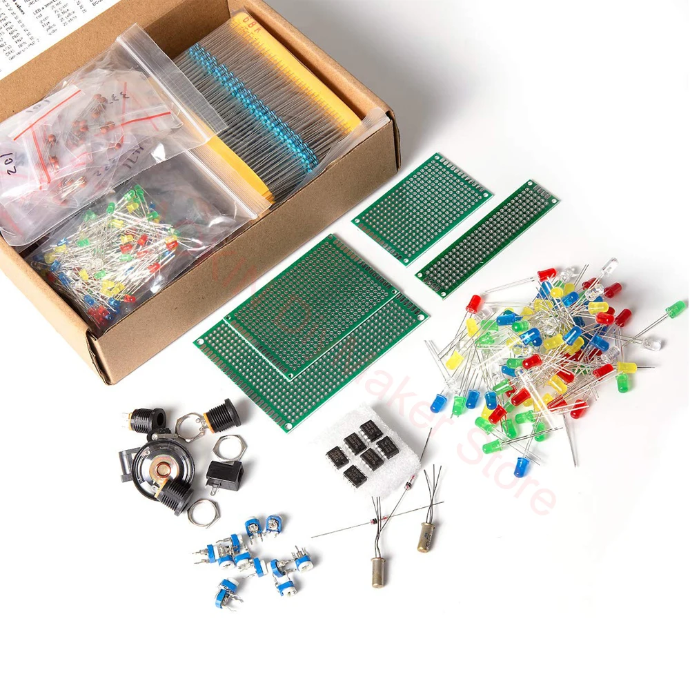 1000 шт. резистор, 170 шт. транзистор, 120 шт. электролитические конденсаторы, 100 ПК-диоды, 200 шт. 3 мм 5 мм светодиодный, 310 шт. керамические конденсаторы, 3 шт. DC-022 3 шт. DC-005 DC разъемы, 2 шт. LM358, 2 шт. NE555, 2 шт. JRC4558, 1 мини-динамик, 2 шт. 1n270 германиевый диод, 2 шт. германиевый транзистор, 12 шт. Обрезной потенциометр, 4 шт. PCB
