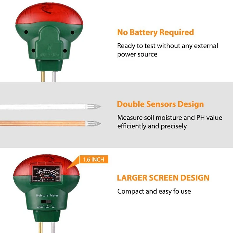 Простота в использовании: Нет необходимости в батарее-просто вставьте датчик в почву более 4 дюймов, переключите переключатель для проверки влажности, pH, солнечного света, который вы хотели бы измерить, затем подождите 5-10 минут, пока указка не перестанет качаться, чтобы получить стабильное считывание на шкале шкалы