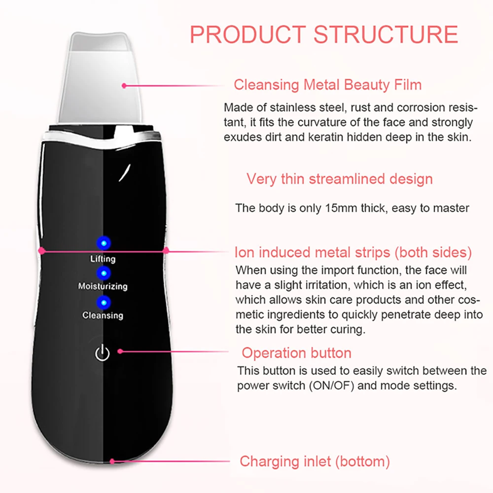 -Несколько функций: Этот скруббер работает через ультразвуковую вибрацию, которая может углубиться в поры, удалить грязь, старение клеток и корней. Он может эффективно удалять акне, угри, устранять морщины и кютис laxa, ускорять кровообращение, способствовать метаболизму, разложению меланина и рассеивать пятна.
